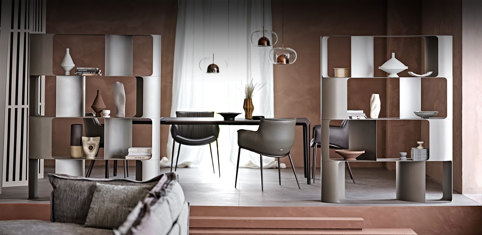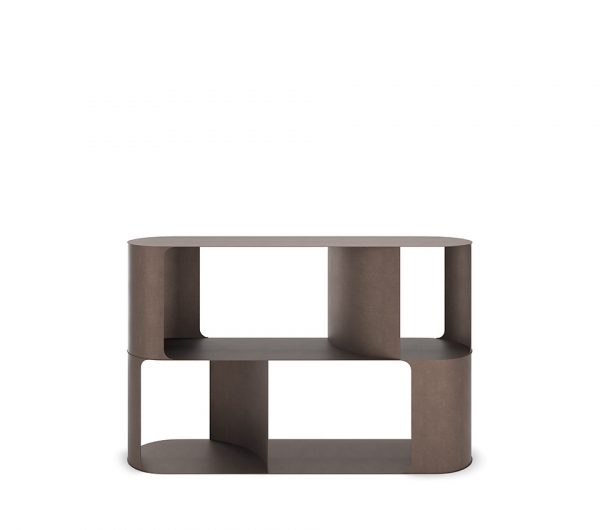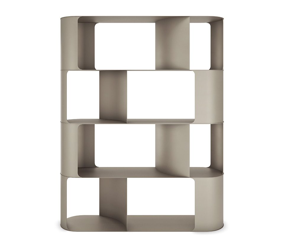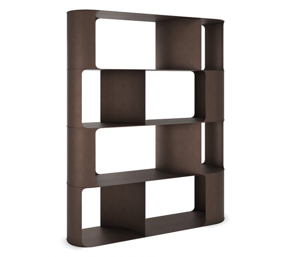 To furnish an environment that conveys tranquillity and balance, but at the same time is a place to regenerate and find new stimuli, the secret is to choose fluid shapes with intriguing decorative details that blend delicately with the design. The Fulham modern steel bookcase designed by Ono Design bases its raison d’être precisely on this aesthetic concept. The structure consists of curved walls and internal partitions, rounded and sinuous. In this way, the transition between the points of light and shadow is soft and suffused. The lack of excess that sees forms prevail over decoration gives life to a modern bookcase with a harmonious and elegant aesthetic. By placing the bookcase in the centre of the room, it acts as an attractive partition, perfectly symmetrical and balanced.