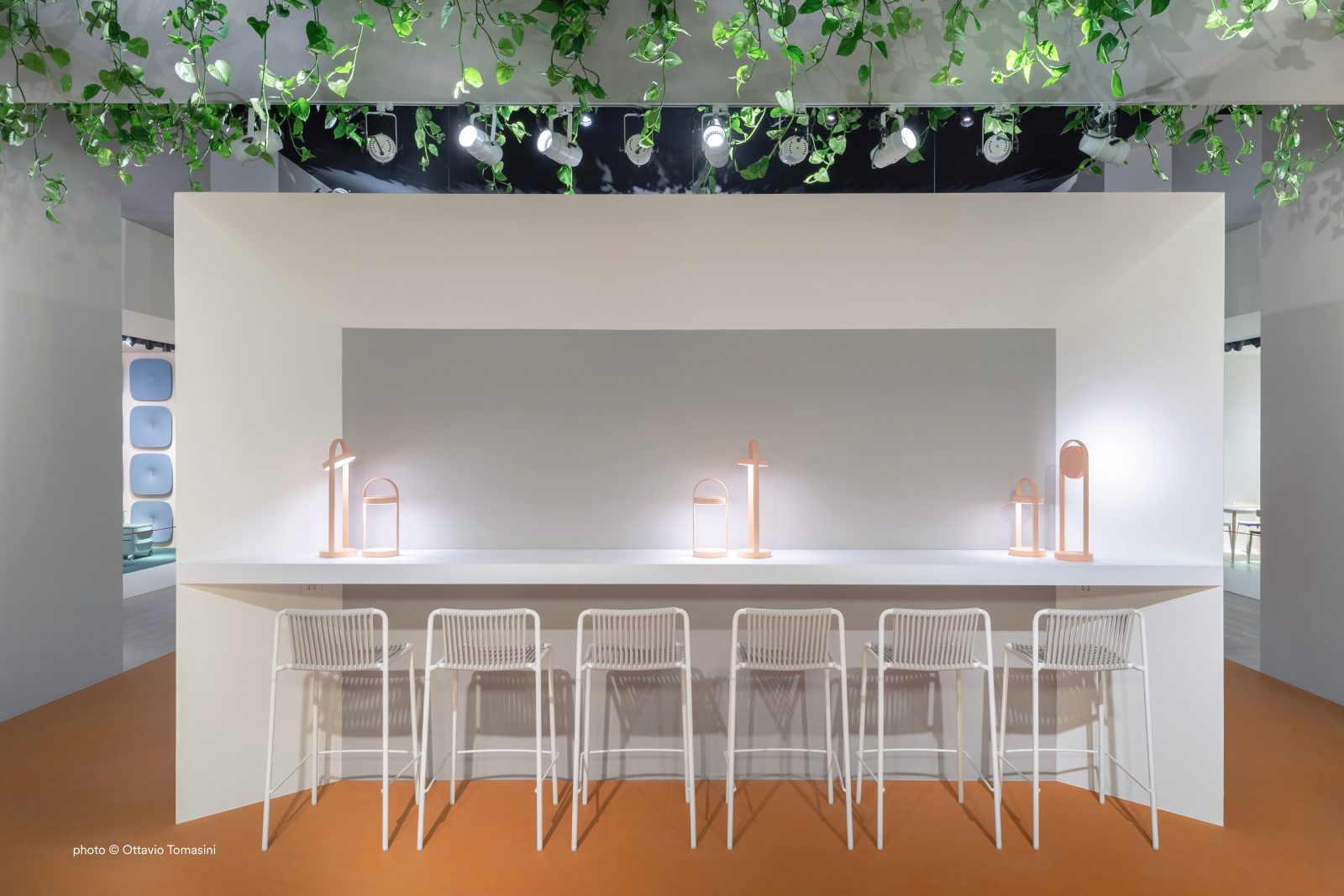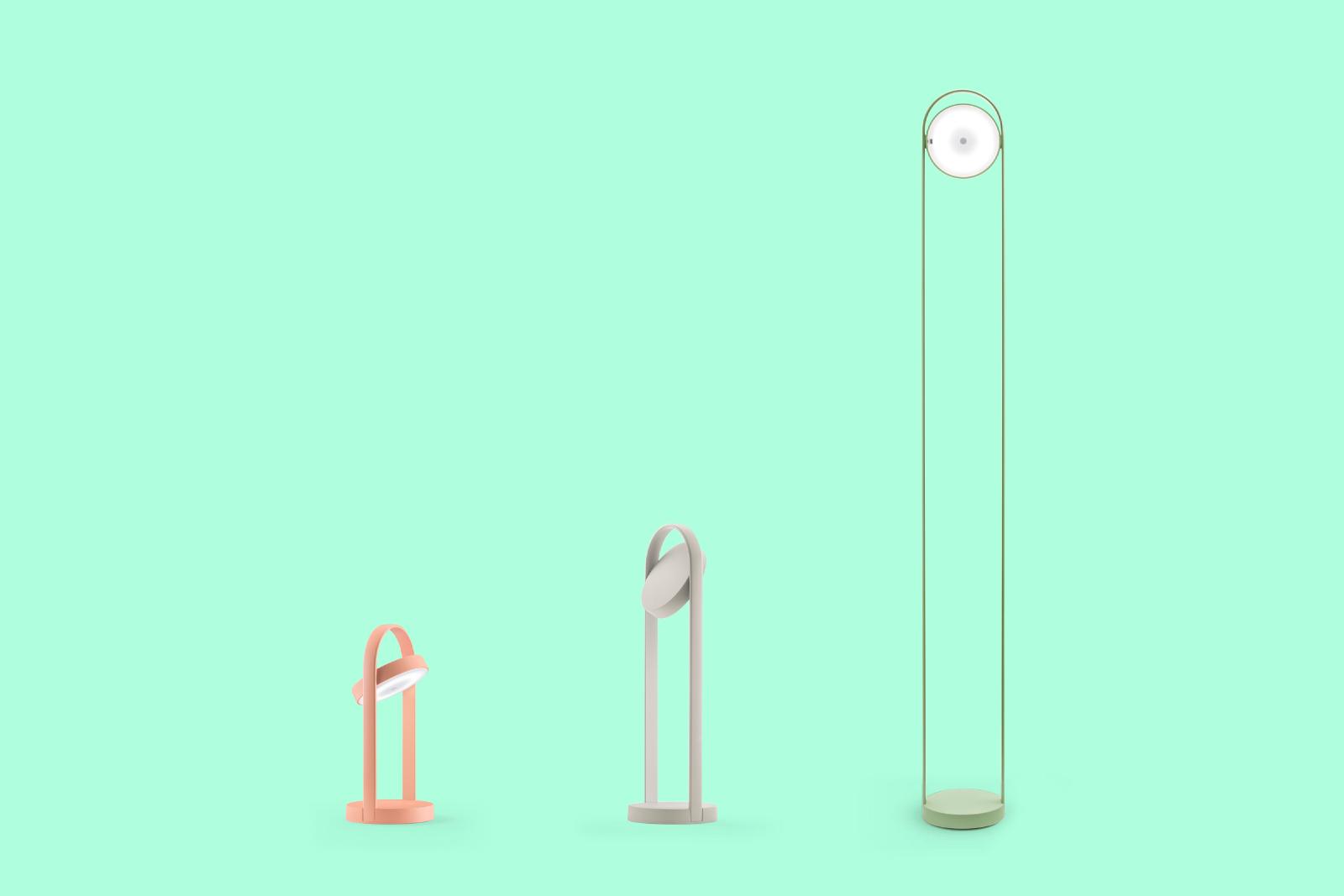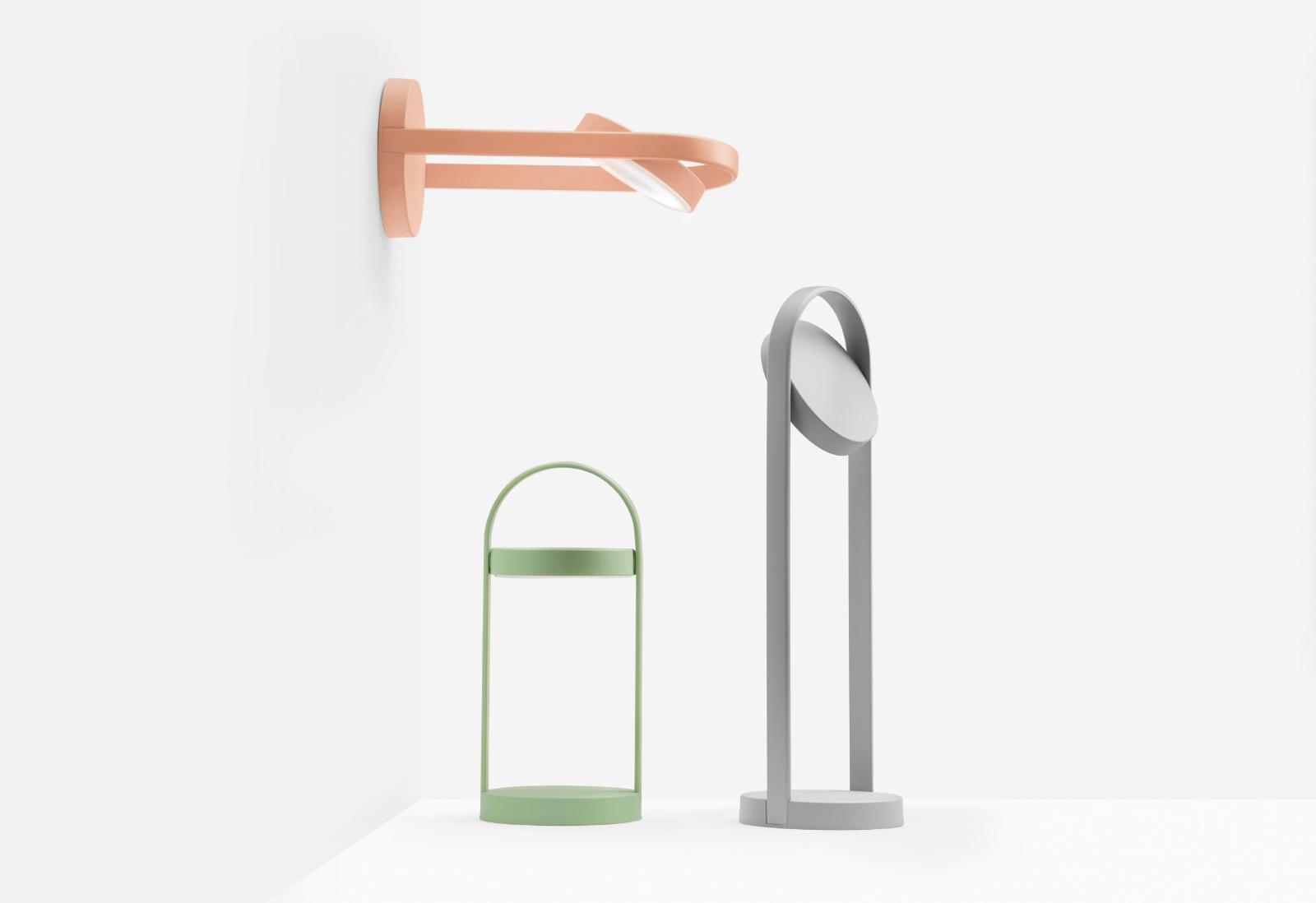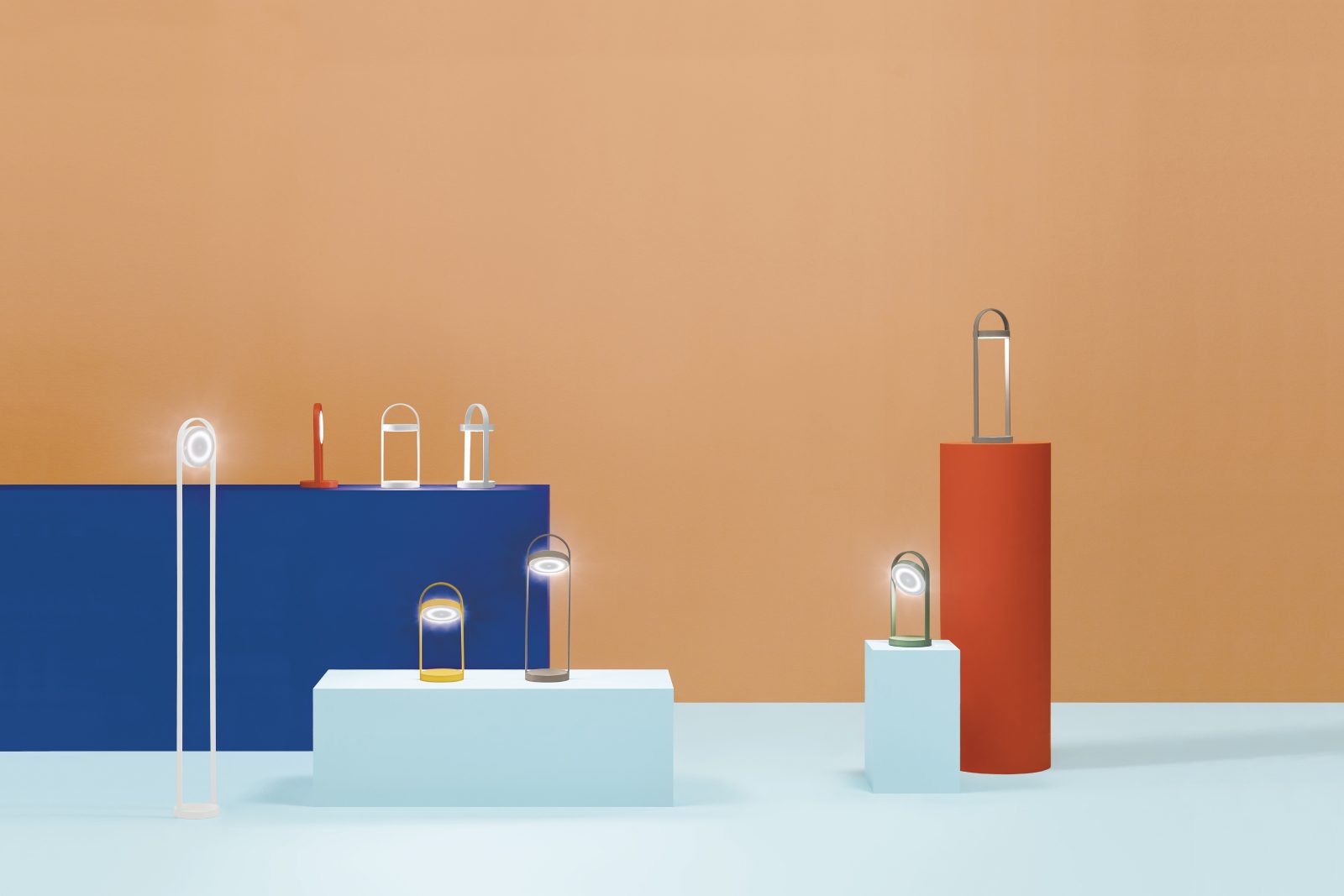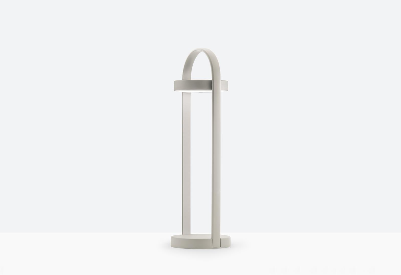 Giravolta is a wireless lighting distinguished by a contemporary design. The main elements are two discs in plastic material, the base and the LED diffuser which rotates 360 degrees and direct the light, and an arc made in extruded aluminium that surrounds the two discs to create a practical handle. The luminaire incorporates the LED board, the lithium battery and the micro USB device for recharge. Giravolta is characterised by a touch control and three light intensities. A magnet in the base as optional allows the fixing of the lighting on metal surfaces, even wall. Height 500 mm.