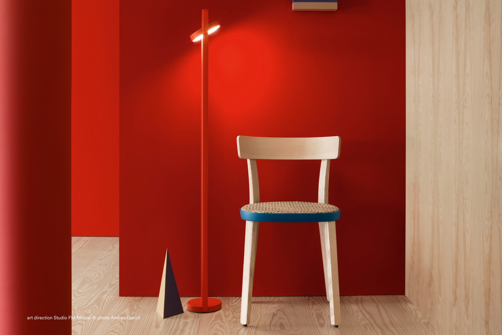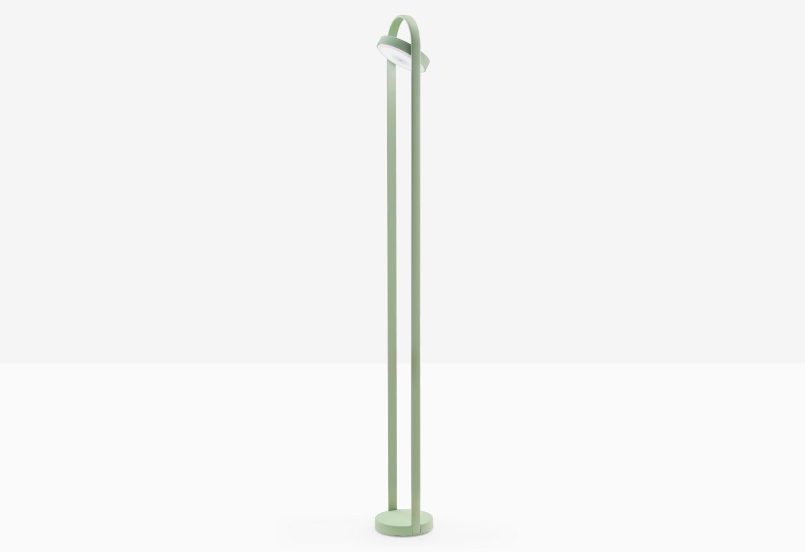 Giravolta is a wireless lighting distinguished by a contemporary design. The main elements are two discs in plastic material, the base and the LED diffuser which rotates 360 degrees and direct the light, and an arc made in extruded aluminum that surrounds the two discs to create a practical handle. The luminaire incorporates the LED board, the lithium battery and the micro USB device for recharge. Giravolta is characterized by a touch control and three light intensities. Height 1300 mm.