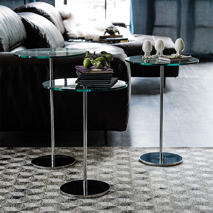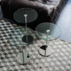 Gliss are elegant and practical modern round tables for furnishing a functional design living room. They are perfect placed next to a sofa or an armchair for keeping your items comfortably within reach. The Gliss models consist of a round base in polished stainless steel, surmounted by a chromed steel stem and a round top. The latter is available in glass and entirely in steel. The side tables Gliss are versatile complements, in fact by combining several tables of different sizes it is possible to create a composition that gives rhythm and dynamism to the room