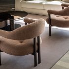 Greta Lounge is a modern chair with upholstered armrests. Its uniqueness lies in the division between the seat part and the wrap-around cushion, which joins the back to the armrests. The floating backrest is soft and comfortable, consisting of a curved, contoured cylinder that wraps around the back, ending in comfortable upholstered armrests. An intriguing interplay of contrasts is created between the seat and the base, superimposing soft and metallic materials, solid and empty volumes, cosy and sharp contours. The central leg at the back of this design armchair is actually two legs placed close together to create a single point of support. The vertical space in the centre plays on the concept of solid and empty spaces between the backrest and seat. The result is a cohesive design that conveys an overall feeling of lightness and balance.