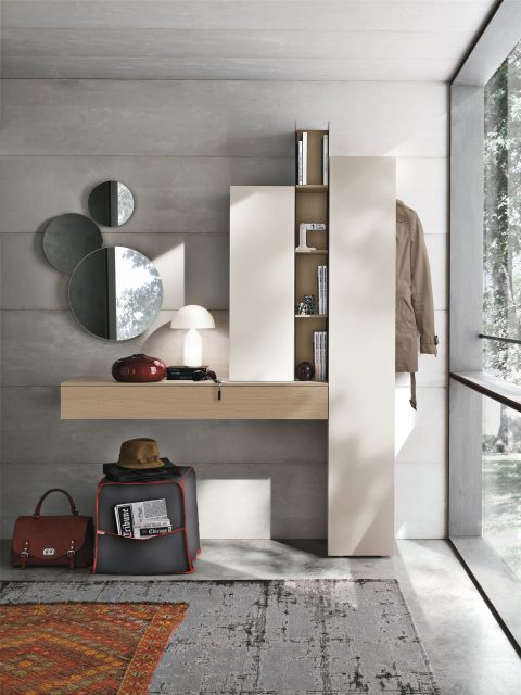 Solutions created and designed to furnish entryways in a welcoming, functional way: wardrobes, shelves, elements for holding items, tops, mirrors and coat hangers can be combined in different ways according to need.