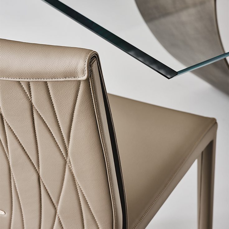 The Italia dining chair has a clean and refined design. This model is smooth and comfortable thanks to the padded cushion that is lightly resting against the backrest. Rigour and simplicity are expressed through the legs and the seat, the structure is made of steel entirely covered in fabric, soft leather or synthetic leather. The Italia Couture leather chair is further embellished by a tailoring on the back of the backrest: a beautiful diamond-quilting that not only enriches the collection, but also ensure this version to be versatile, suitable for a design living room of both residential projects and workspace design projects. The Italia collection also includes armrest chairs, for both versions.