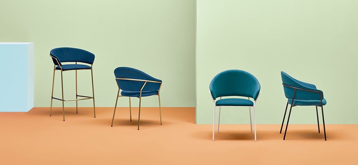 Harmony of shapes, ergonomics and elegance are the characteristics of the Jazz armchair. The seat and the curved backrest are supported by a light steel structure. Personalization is ensured by the combination of the upholstery, in fabric or imitation leather, and different steel finishes.