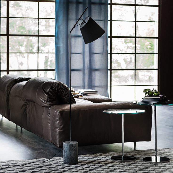 The floor lamp Karibù has a long-lined and delicate design. The lampshade of this modern design floor lamp is covered in soft cotonette with a welcoming effect that contrasts with the cylindrical base in painted concrete. Karibù illuminates with great originality and makes a contemporary design environment inimitable.