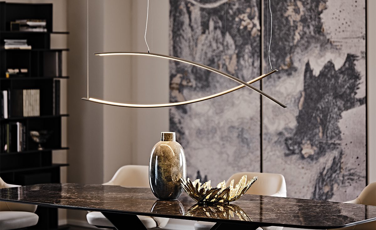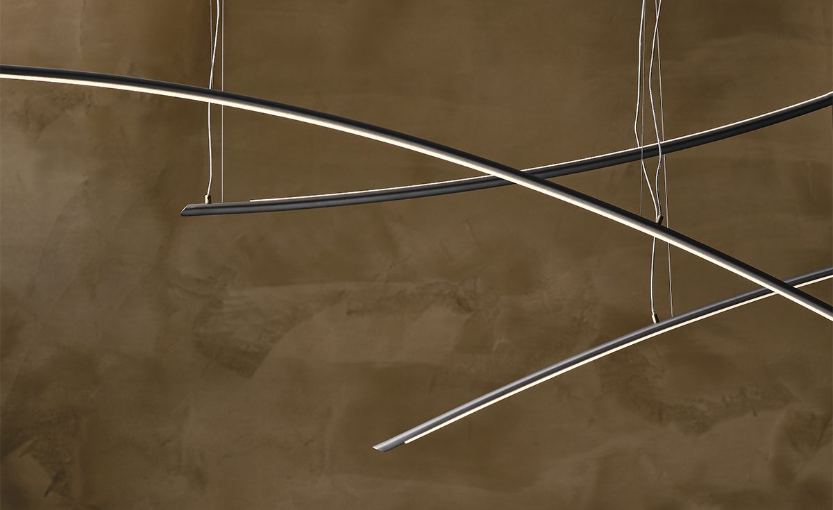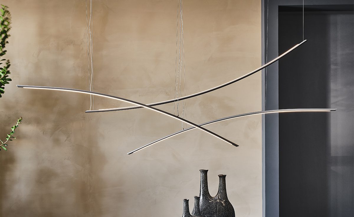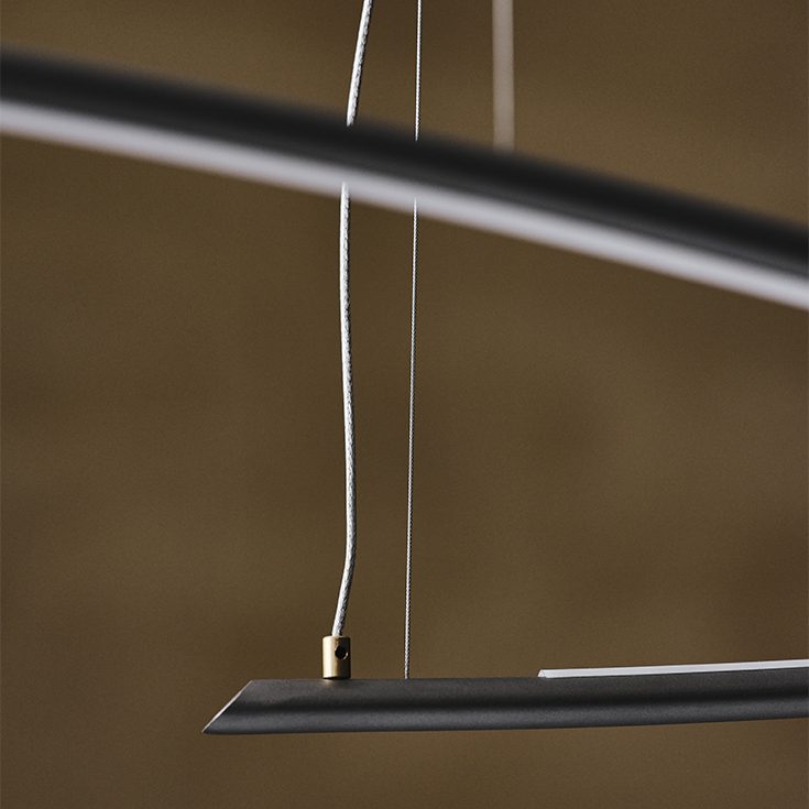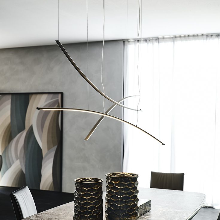 It is produced in 2 versions: Katana and Katana Magnum. The second is equally long but larger, as the name suggests. Both variants are divided into UP and DOWN versions, depending on the direction in which the arc is facing. What makes this modern lamp highly customisable is the opportunity to create arrangements by combining all available versions into one striking and ultra-contemporary chandelier.