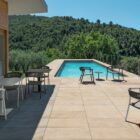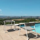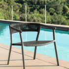 The slim chair evokes lightness and stability. The backrest is obtained by curving the rectangular-section aluminium tubular pieces and it is covered with rope. Texteline cushion.