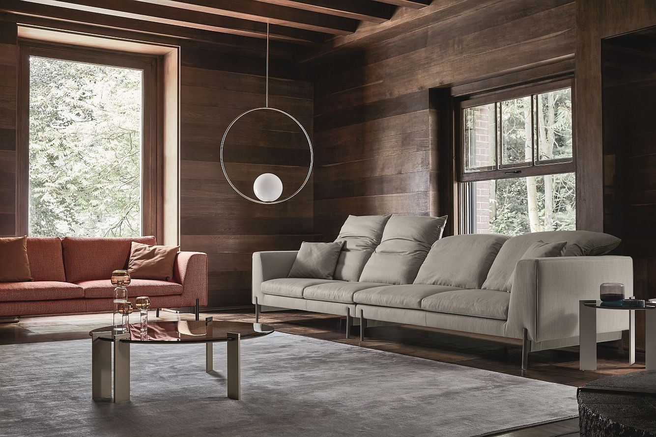 A sofa with high, comfortable cushions, and a progressive abatement mechanism