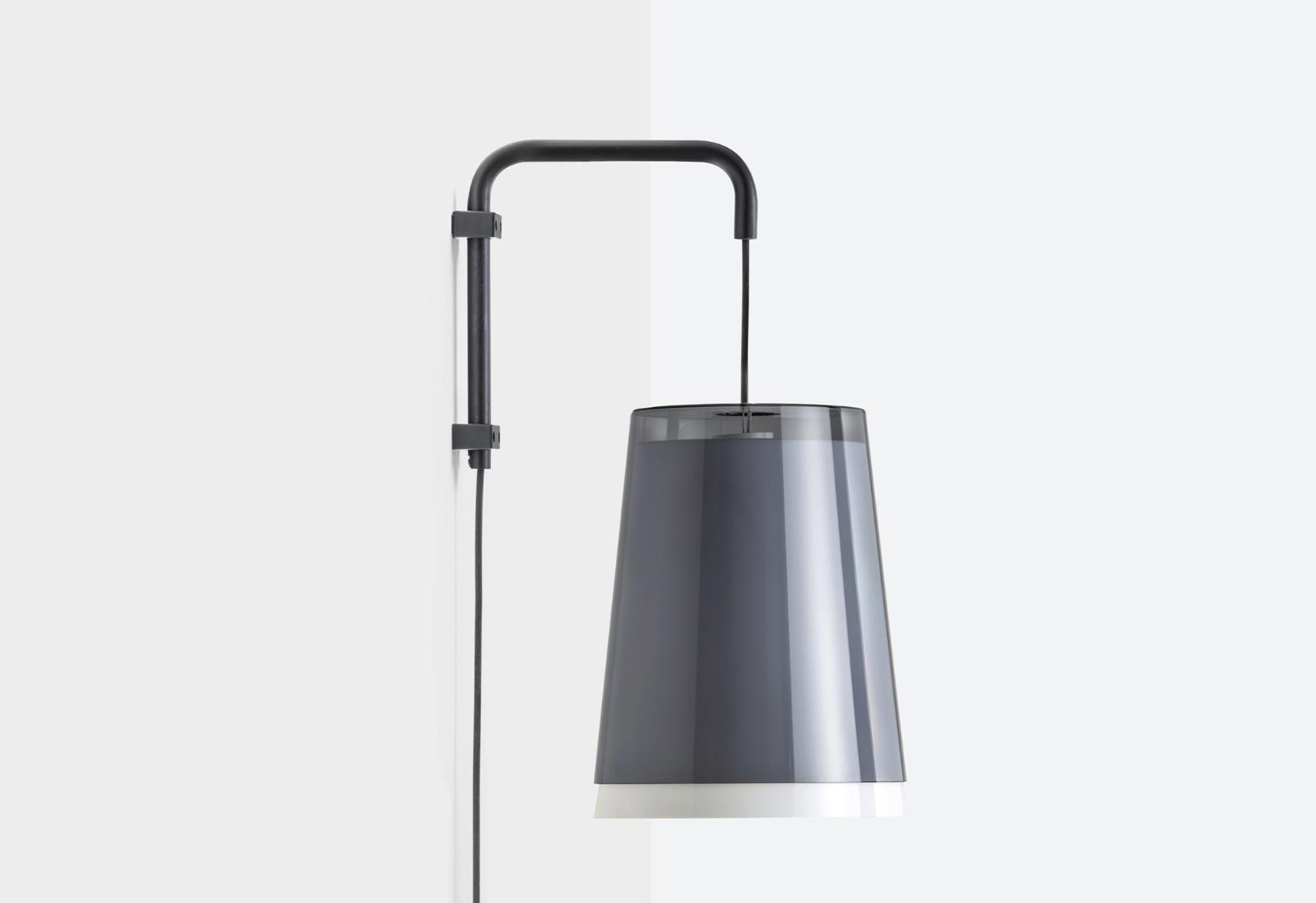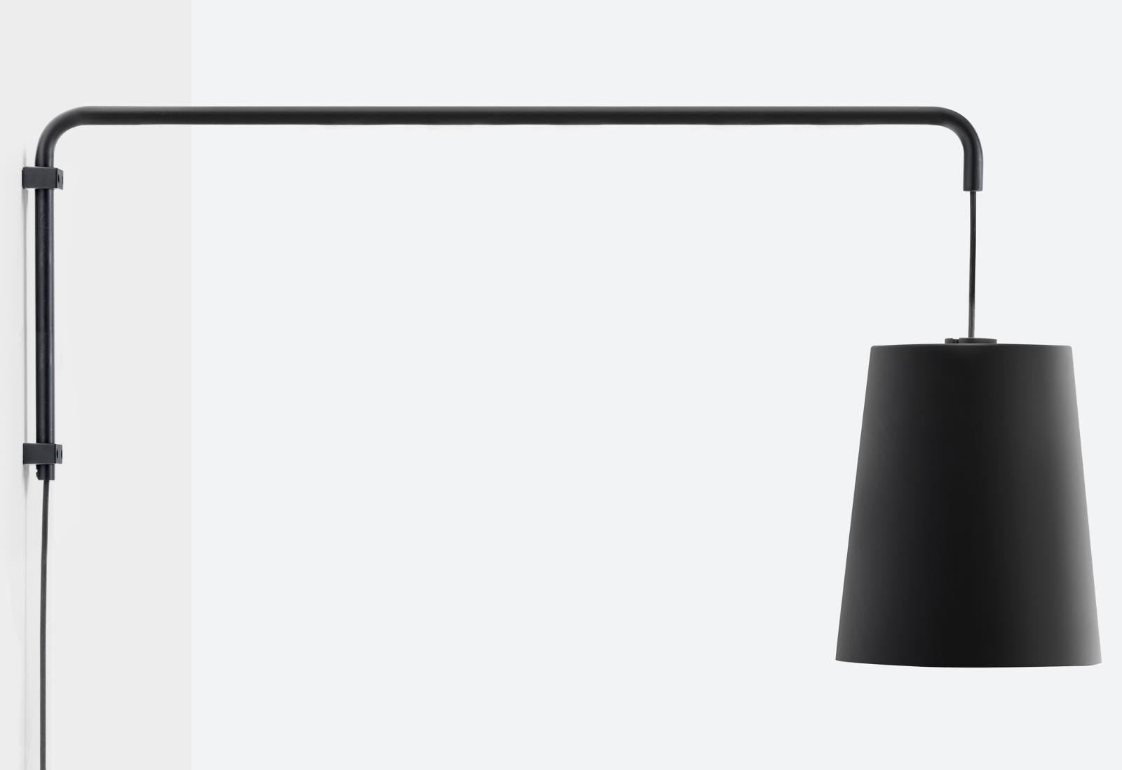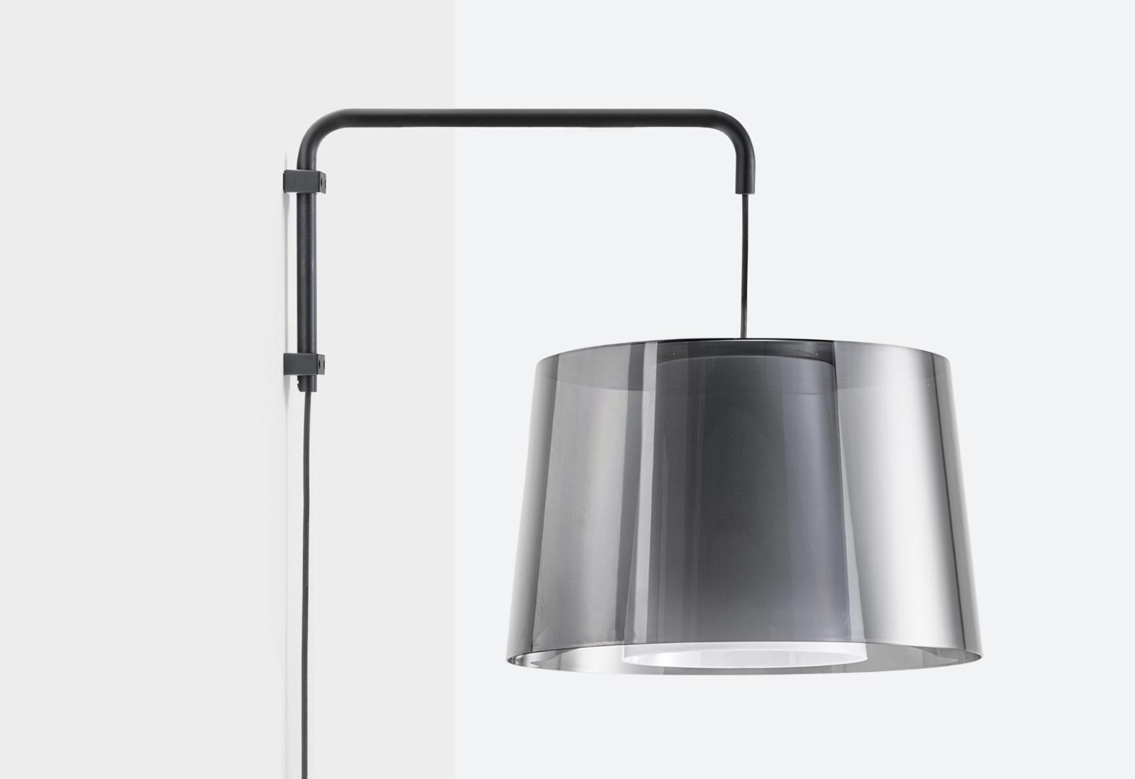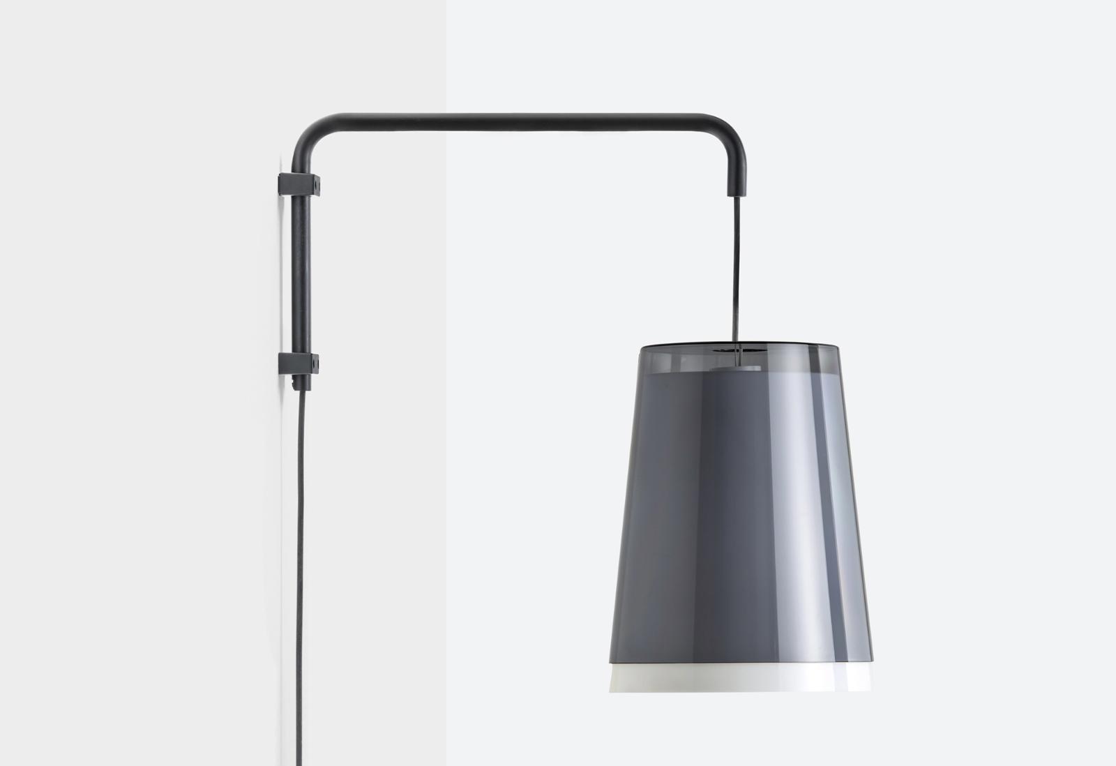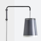 Wall lamp with injection-molded polycarbonate diffuser, exposed cable and metal arm available in various sizes.