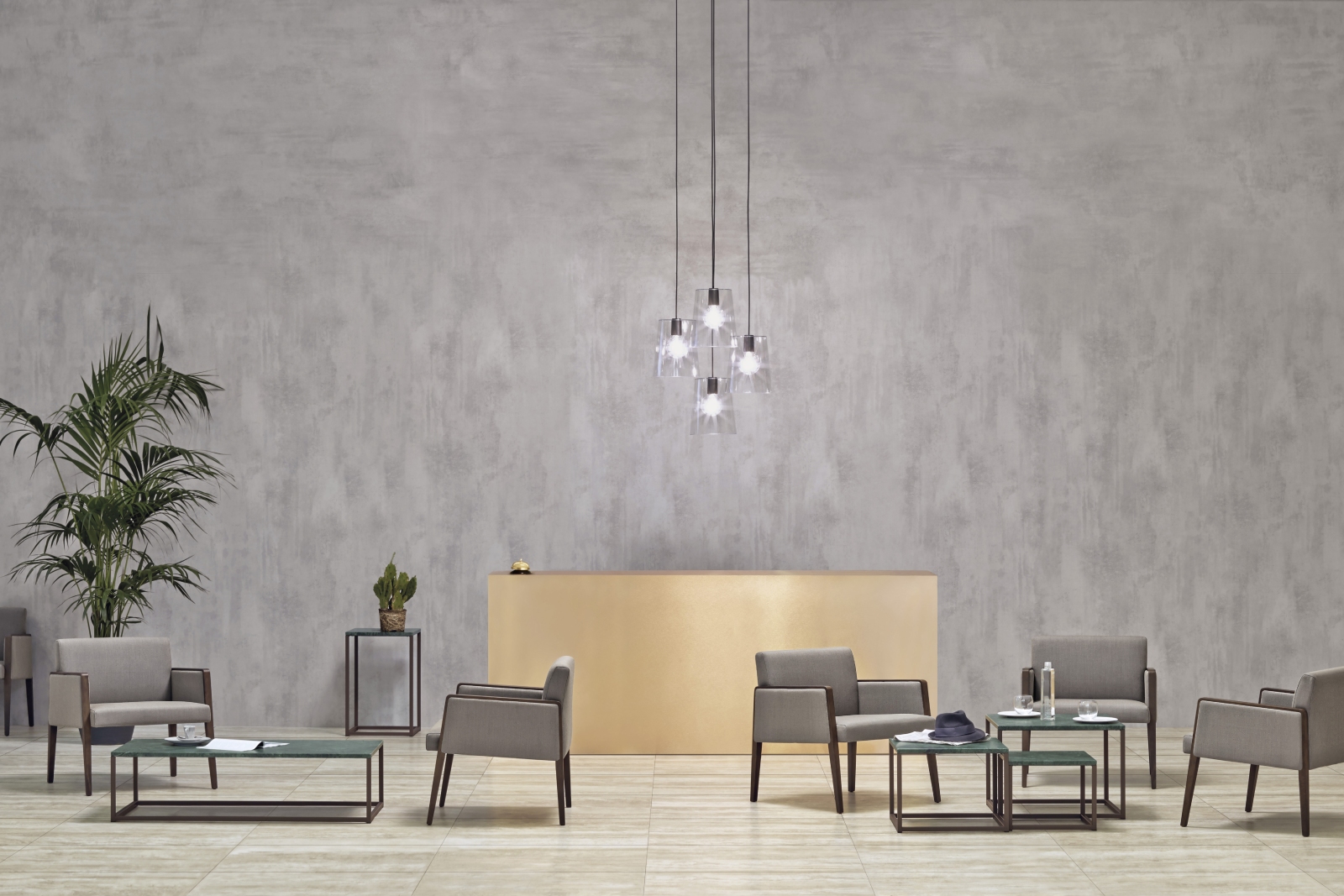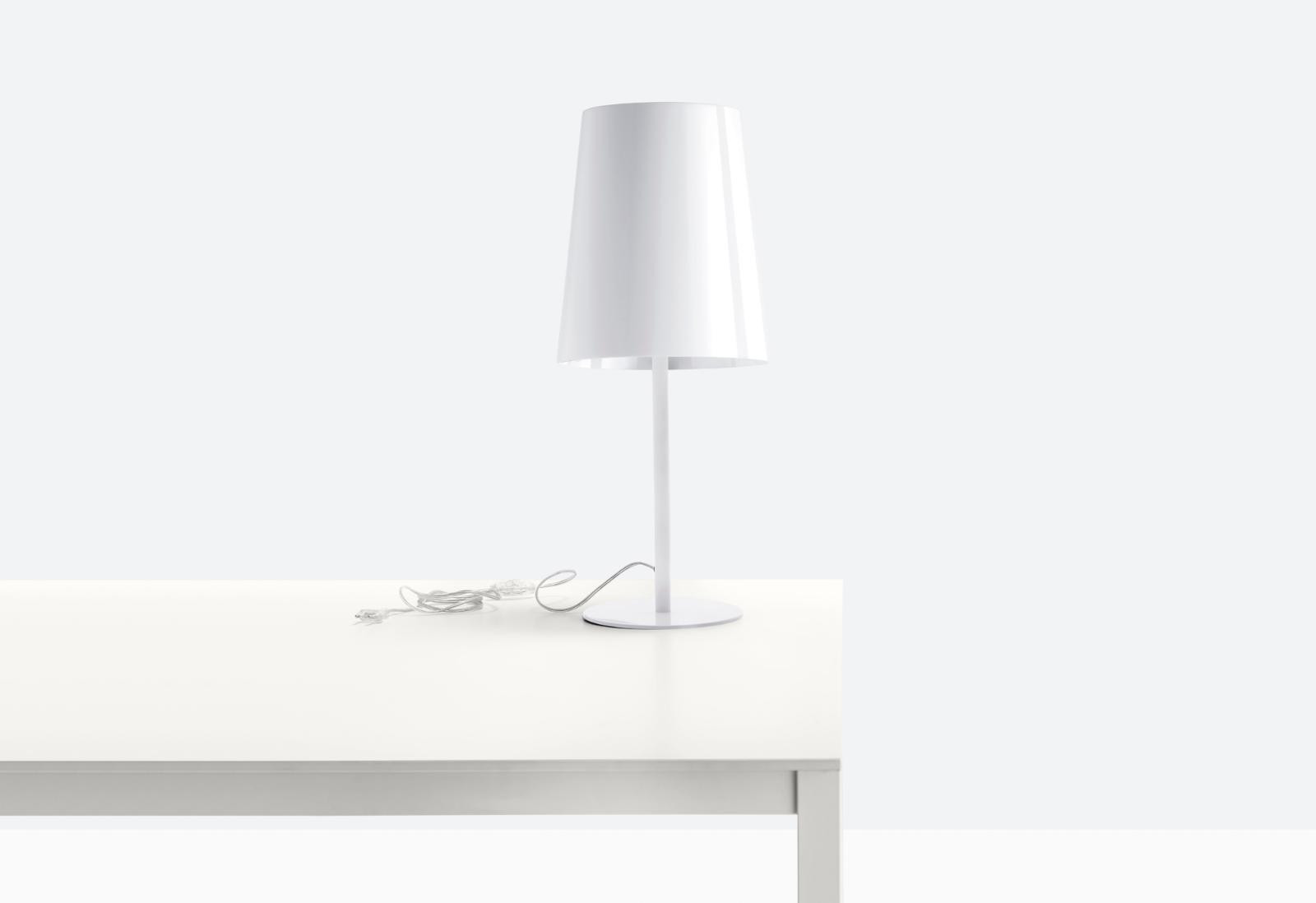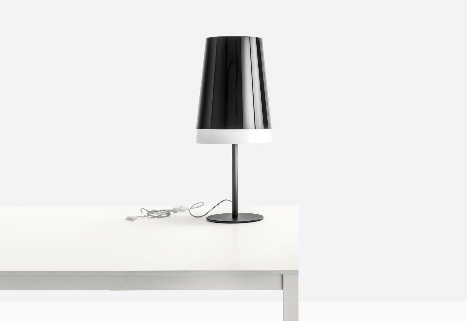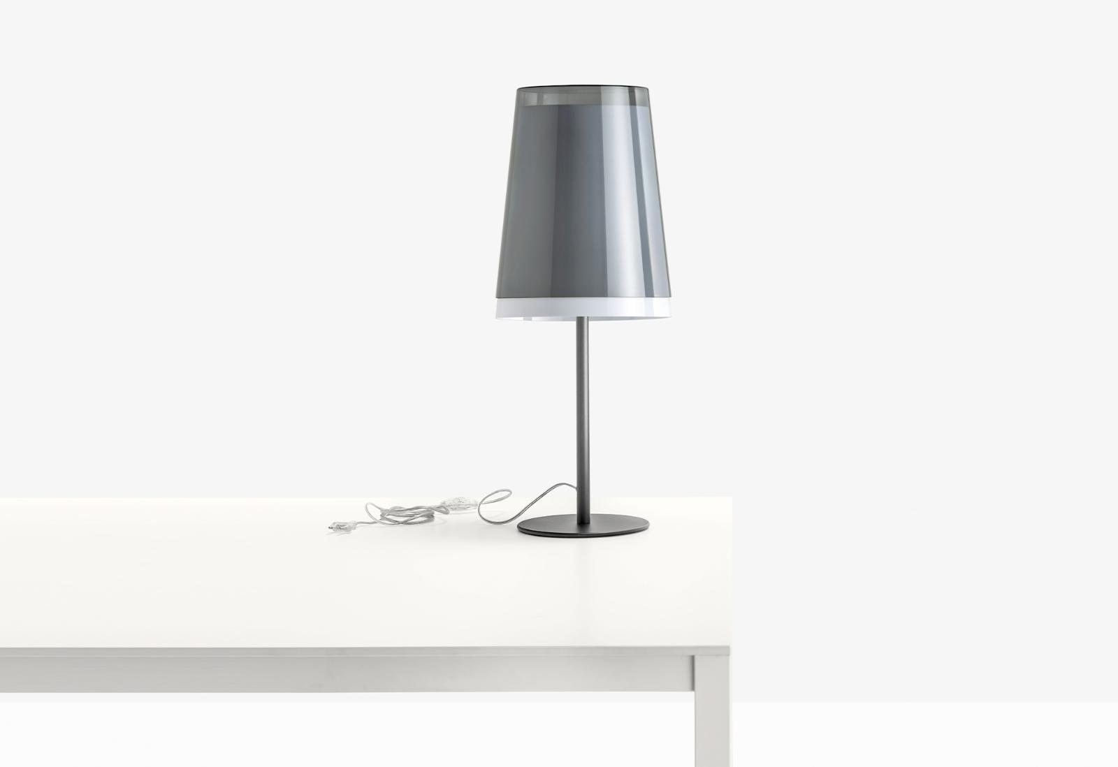 Table lamp with injection-molded polycarbonate diffuser, steel base and central stem. Available with single or double diffuser.