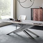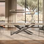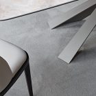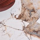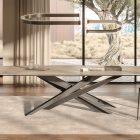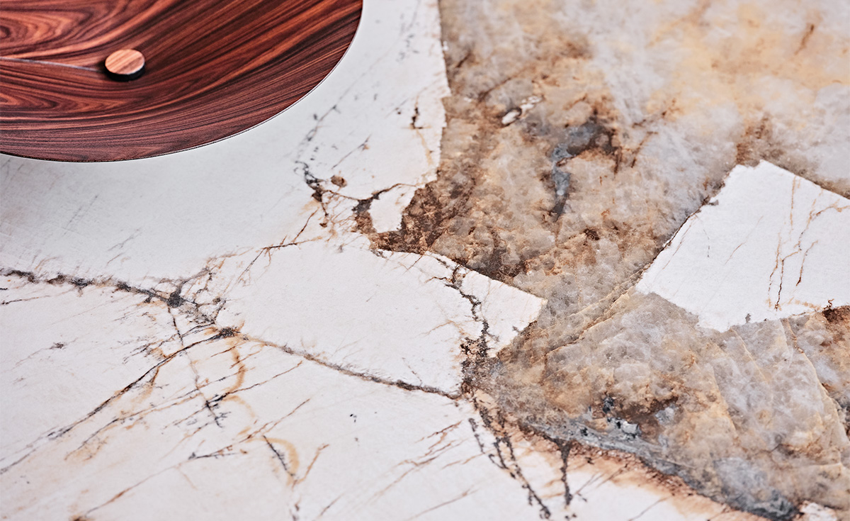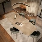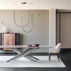 The bold aesthetic, unafraid of attracting attention, extends to several variants. The standard model is made of transparent glass, allowing you to appreciate the sculptural base in its entirety. The Lancer Moonglass model, in contrast, is a modern decorated glass table with a three-dimensional bronze finish, irregular to the touch, which the designer imagines as a satellite to be explored. Finally, the Lancer Keramik and Lancer Wood versions are respectively a ceramic table model and one with a precious wooden top, with finely worked edges.