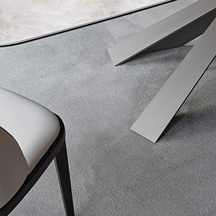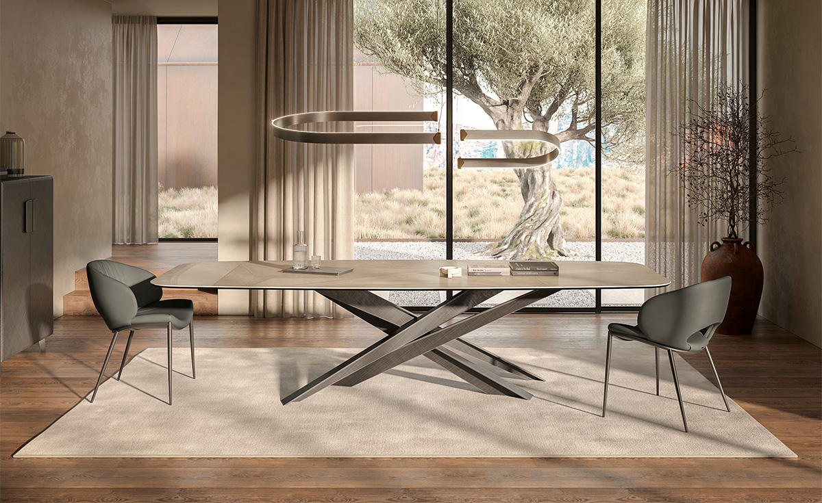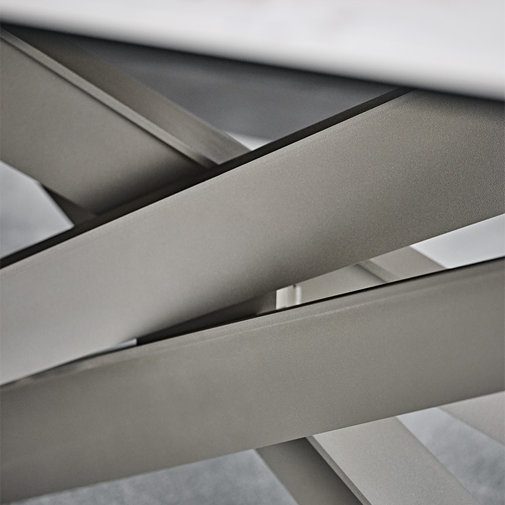 What makes Lancer a unique and precious model is the base with a strong architectural value, enlivened by a punchy graphic sign. Four blades cut through the air and intersect each other, creating an energetic composition with an apparently irreproducible pattern. Each leg is designed with a T-section, which multiplies the opportunities for crossing and overlapping. The entire base is thus strengthened by a rhythmic chiaroscuro effect, in which the blind zones contrast with the metal portions struck by the light.