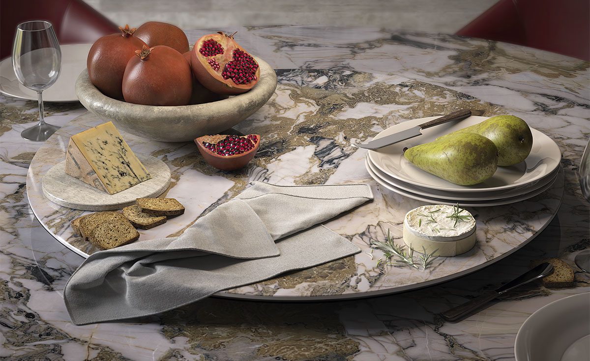 The revolving tray Lazy Susan is available as an accessory combined with the Cattelan Italia round tables, to ensure greater comfort for diners. Lazy Susan comes in different sizes to suit the table and in an array of fine finishes to amaze your guests, with great elegance and practicality.
