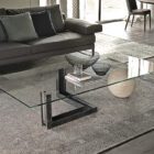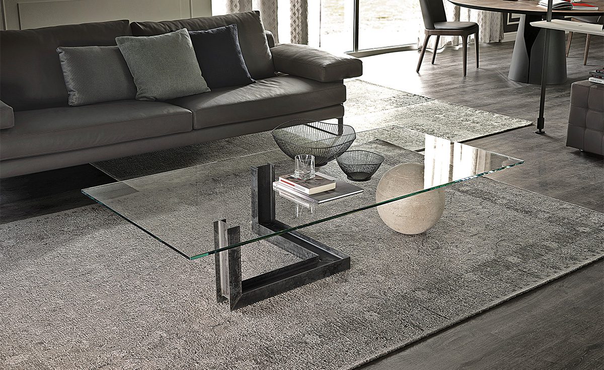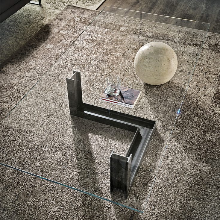 Levante is a design glass coffee table created by Giorgio Cattelan, with an incisive sculptured character that completes a modern design living room with style and elegance. The glass top lets you appreciate the base, made up of two contrasting sculptural elements, in its entirety. The first is reminiscent of a steel beam, bent at right angles, whose rough finish enhances its industrial style. The second is a sphere in natural travertine whose porosity contrasts with the hardness of the glass and steel next to which it is placed. This modern glass coffee table for the living room is an item with an original yet refined style, thanks to the materials worked with skill.