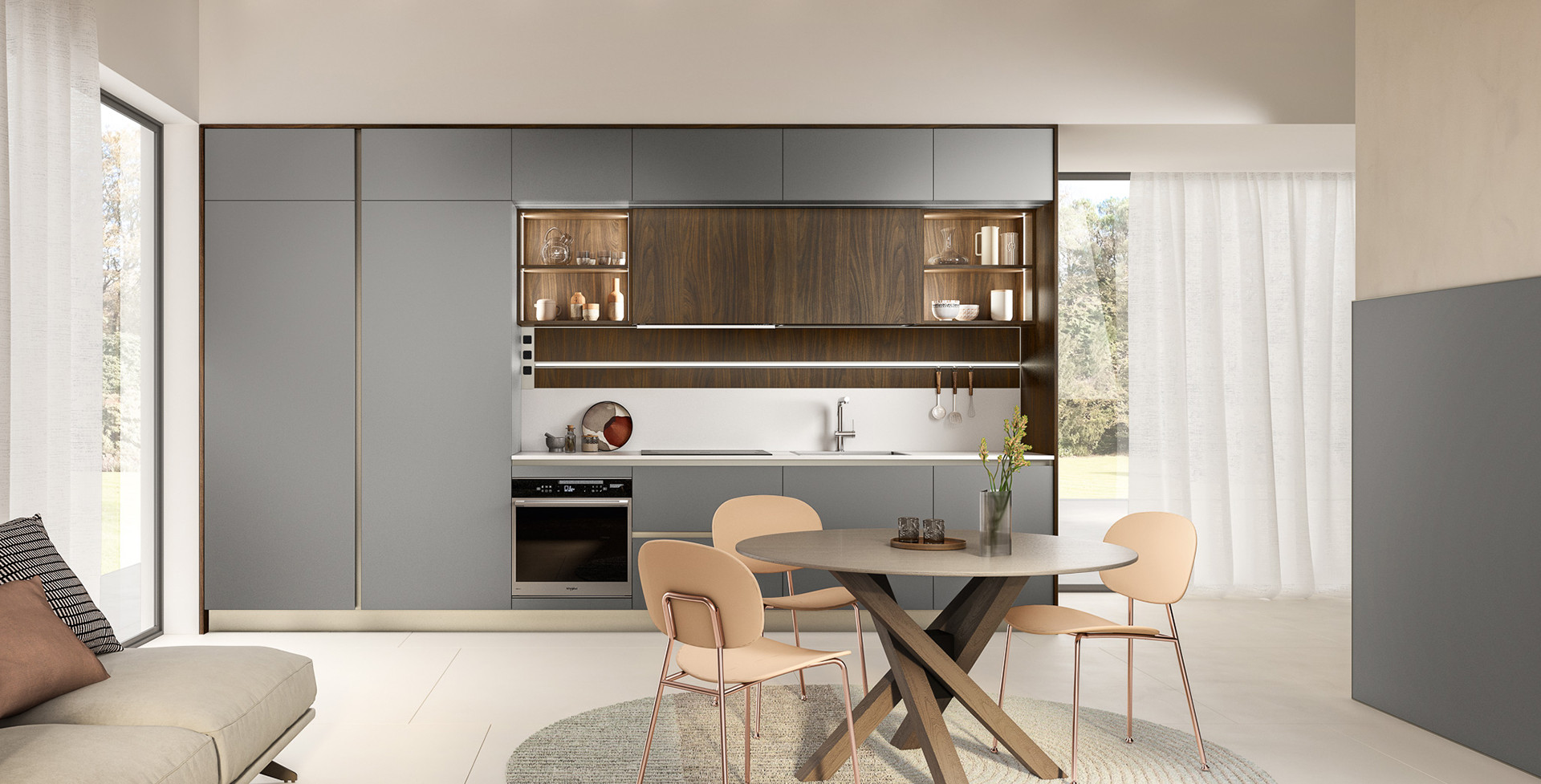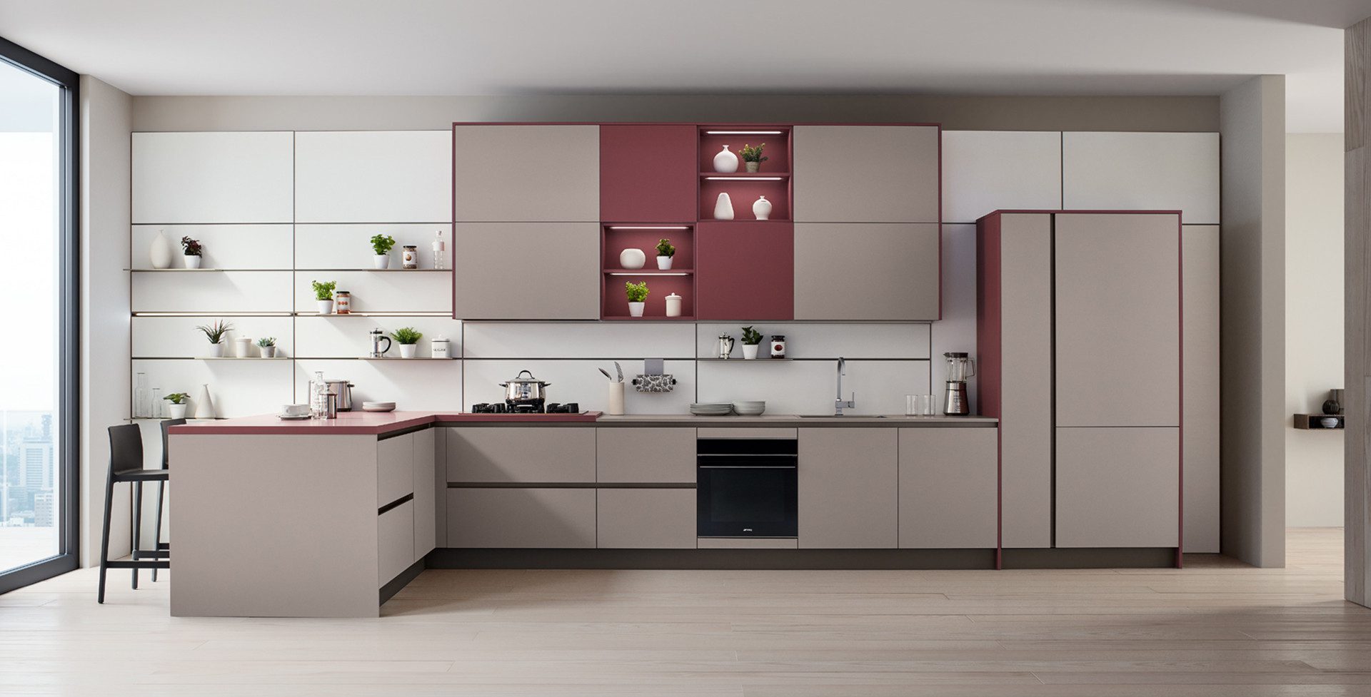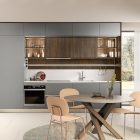 Being in the right place at the right time is one of the fundamental requirements for a product that is “quick”. Like, with its unusual and refined door, lacquered on one side only and with glass-effect edges, is an exact fit for the philosophy underlying Quick Design by Veneta Cucine.