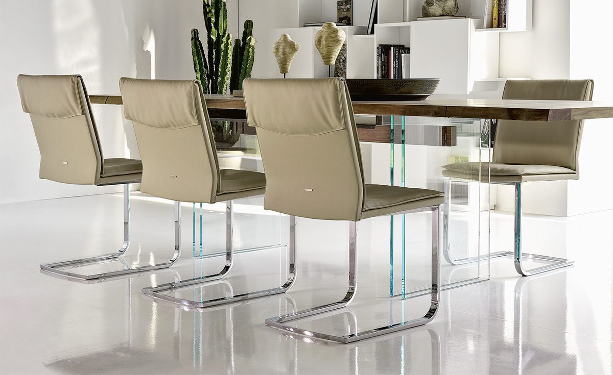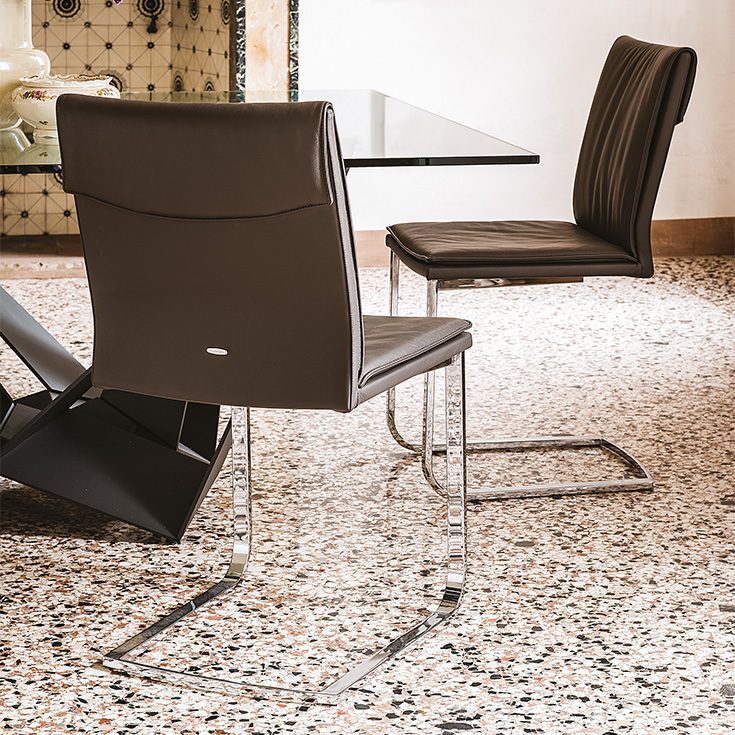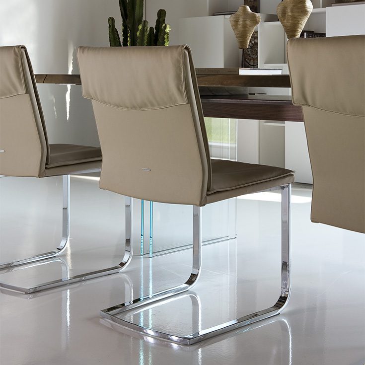 Pure design is the focus of the upholstered cantilever chair Liz, which embodies raw materials of absolute quality and a contemporary, unmistakable style. Designed by Paolo Cattelan, it presents the typical curved base of the cantilever chairs, made from a single steel bar. This designer chair can be upholstered in a wide range of refined colours and fine materials. Available with or without armrests and with two backrest heights, it puts shape completely at the service of function, absolute comfort and conviviality.