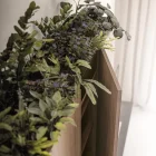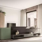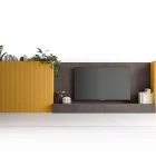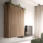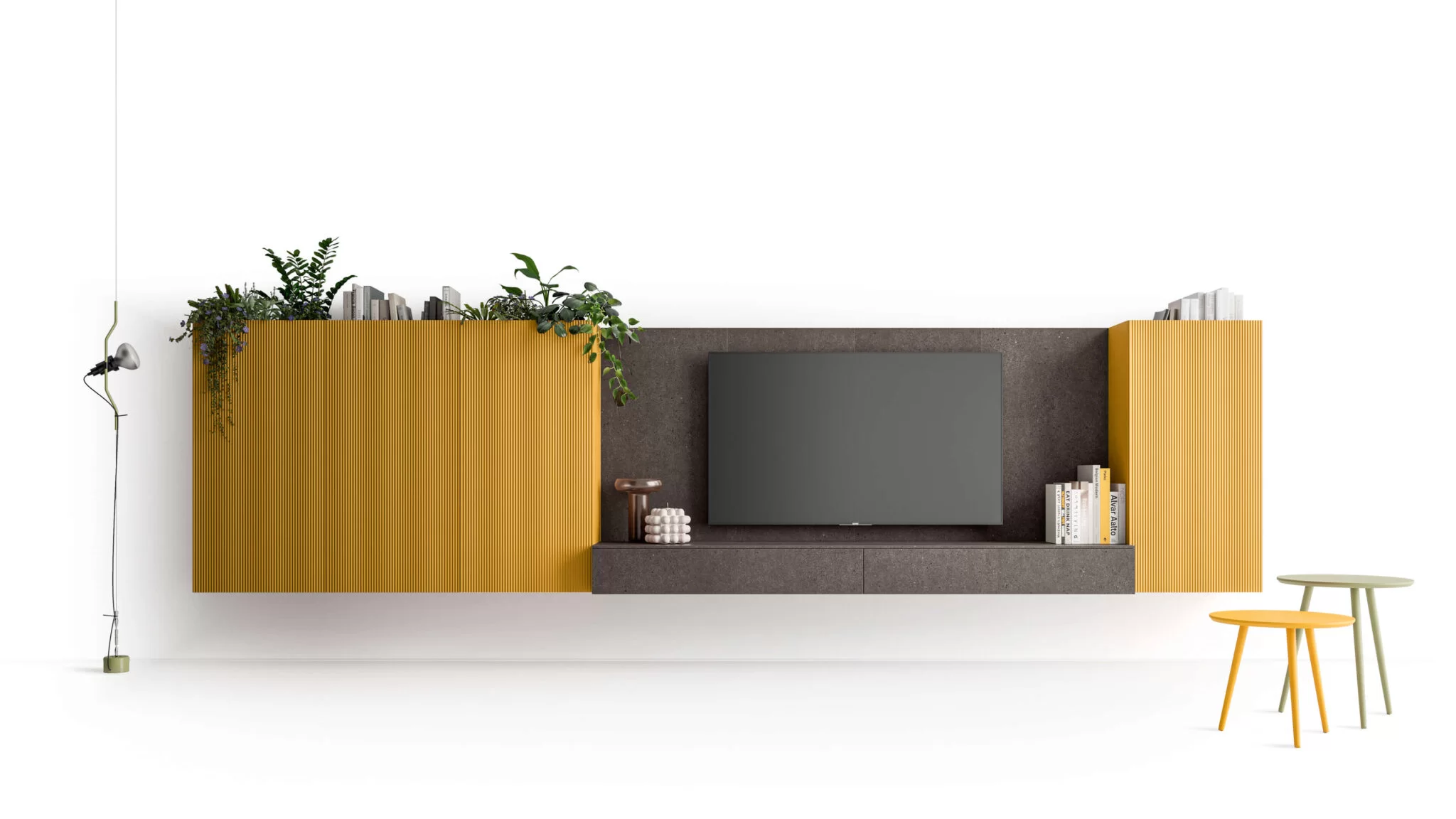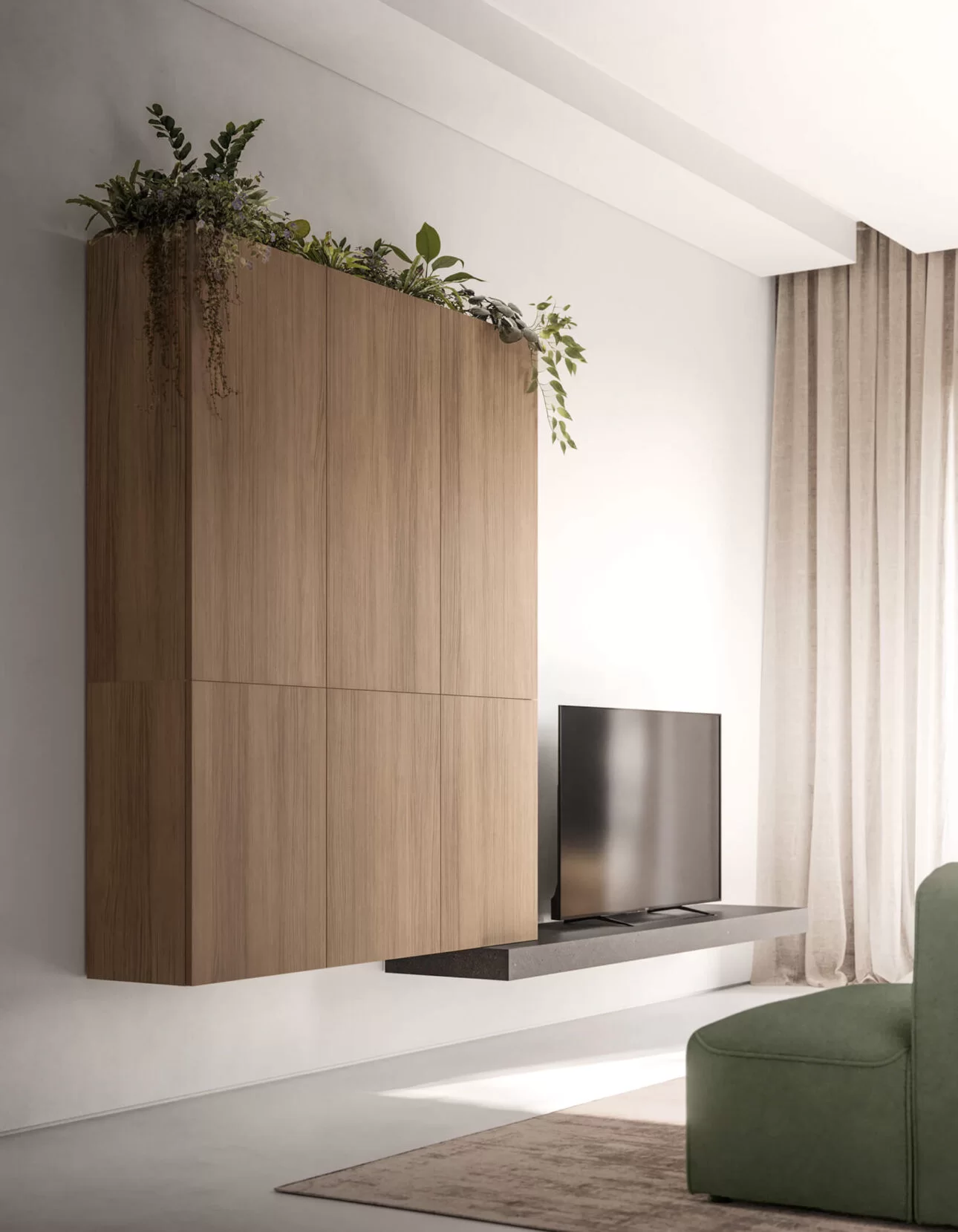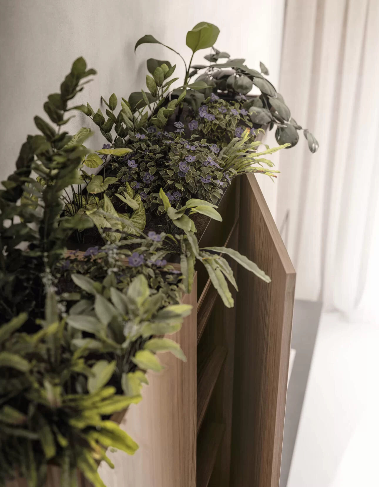 A living room composition featuring Green units and an accessorized back panel behind the sofa. The Green units are both functional and decorative: they feature a metal tray on top of the wall units that serves as a plant holder. This solution exploits the vertical height and provides an alternative way to add a touch of green to the room. The sofa is the home of relaxation and, in this composition, it takes on new purpose: the boiserie paneling fitted with open compartments, a storage unit and chunky shelf built into the back represents a new way of interpreting the living room space.