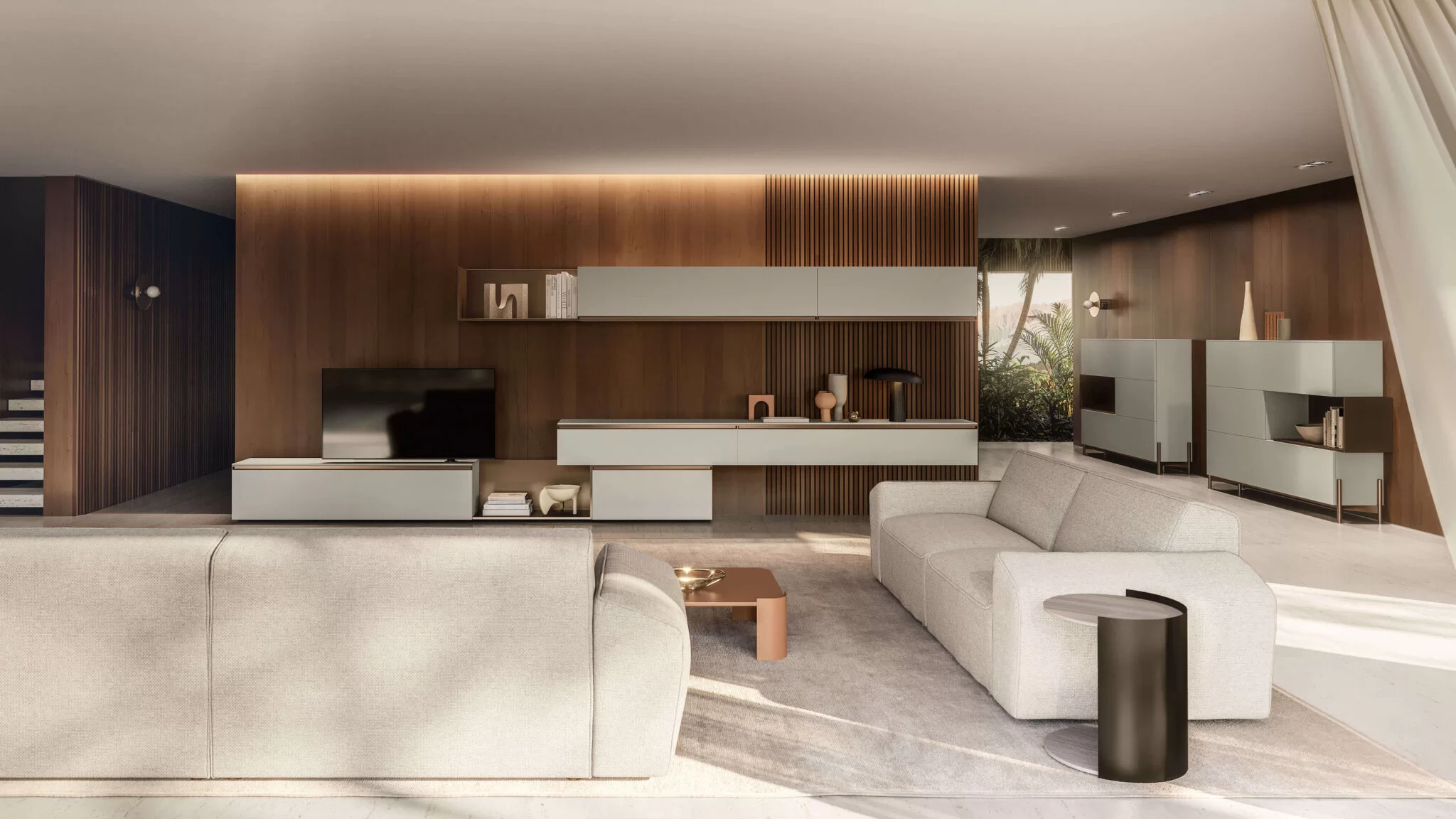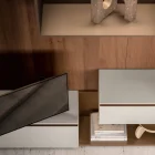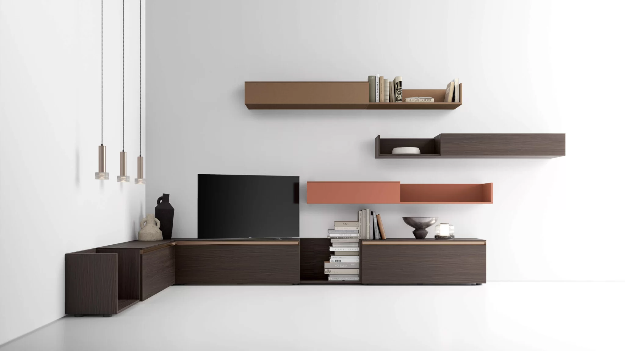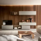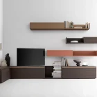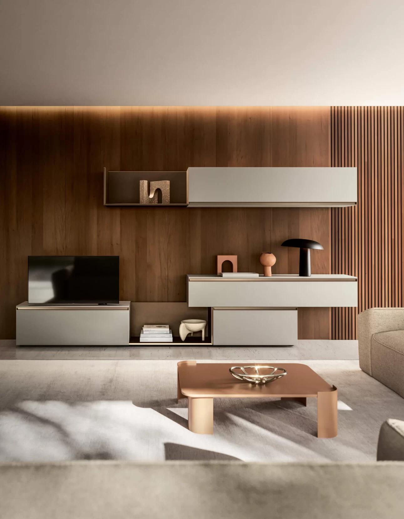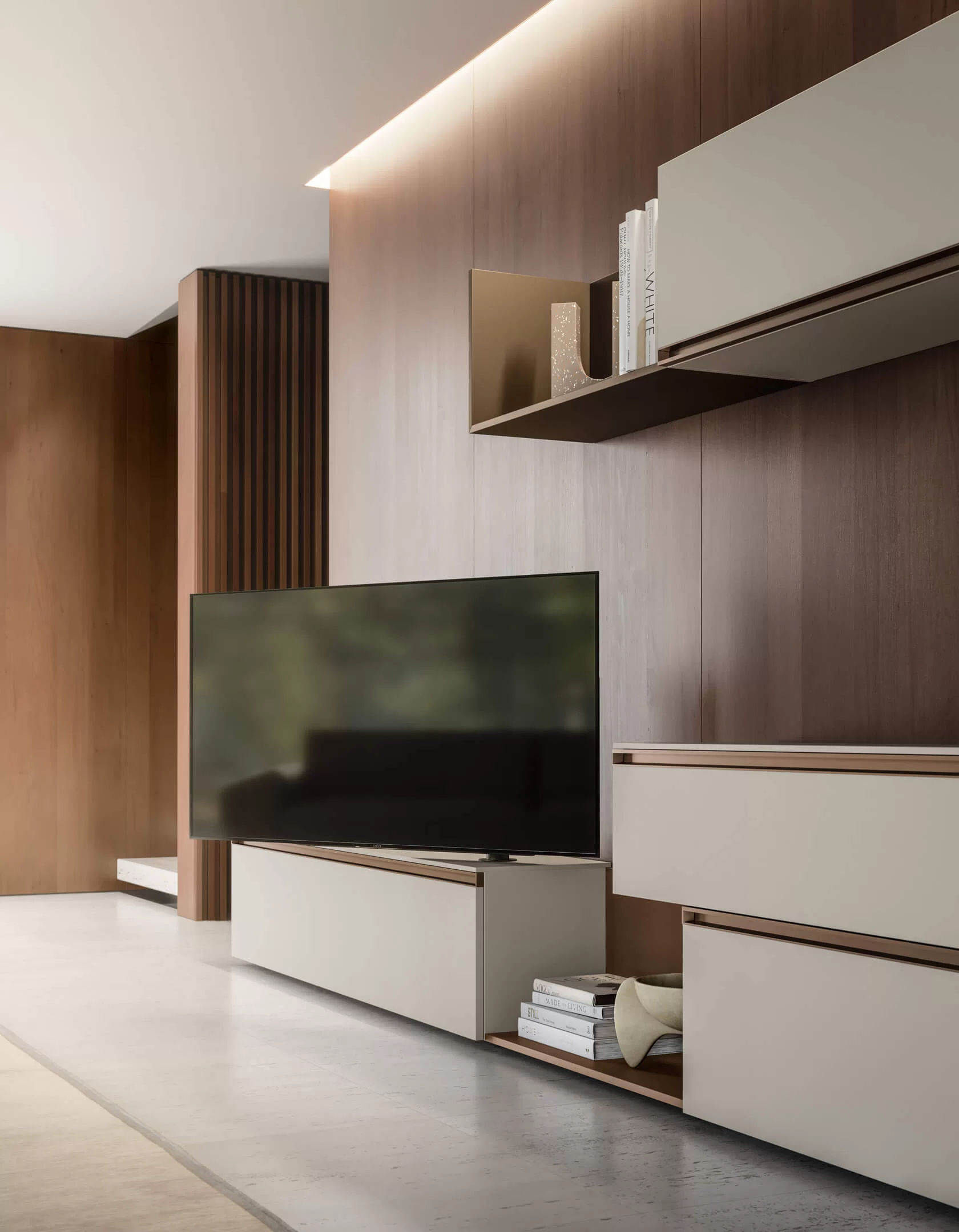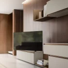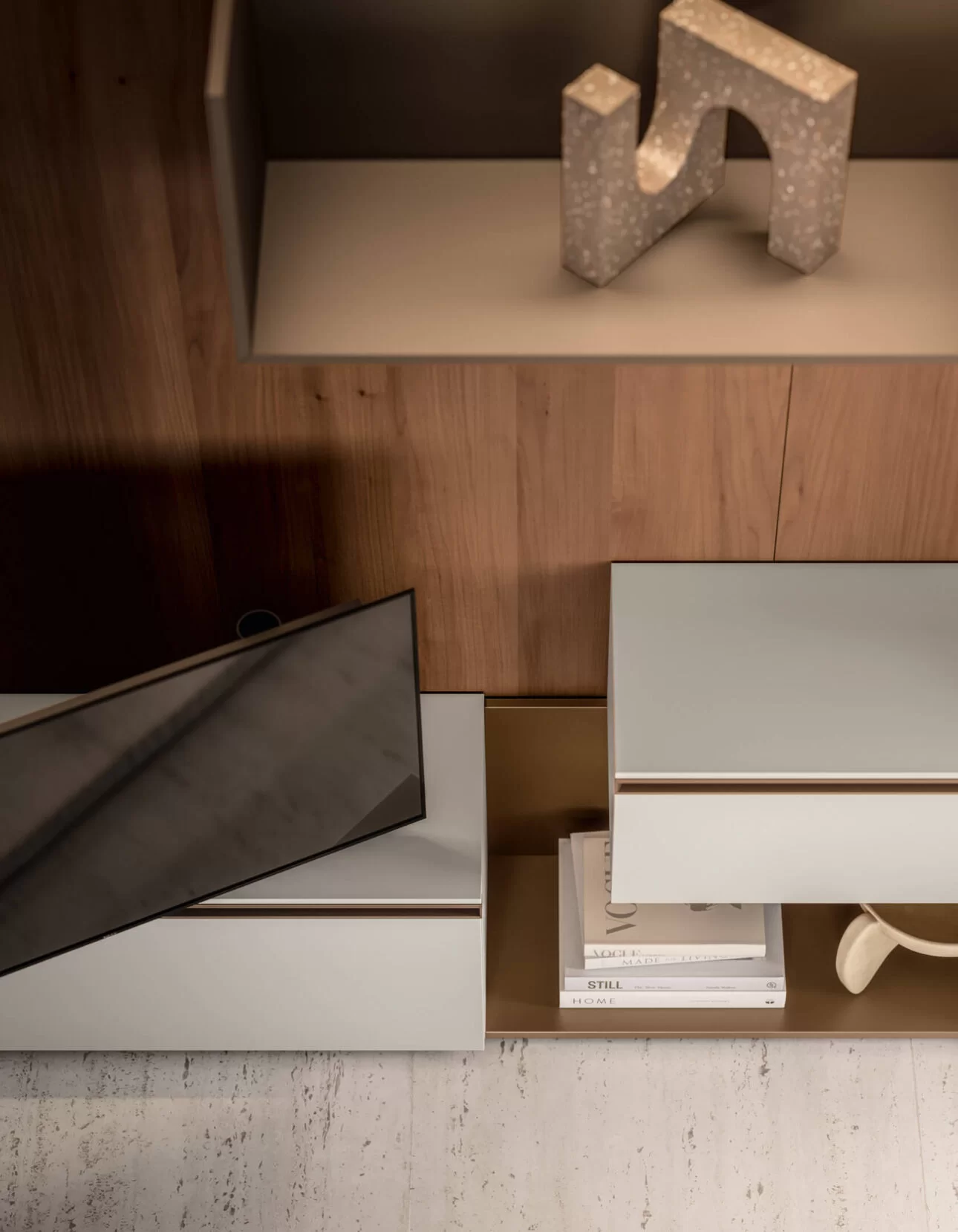 The composition stands out for its storage units featuring the Ego handle in the same bright metallic finish as the Fold units, slotted in between the base units and alongside the wall unit. The movable TV stand bracket built into the base unit allows you to turn the TV by up to 70°. This practical solution means you can watch TV from multiple angles in the same room. The design of the open Fold units breaks up the composition and lightens the look. They come in two widths and many finishes, to suit any space and coordinate with other pieces of furniture.