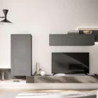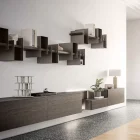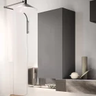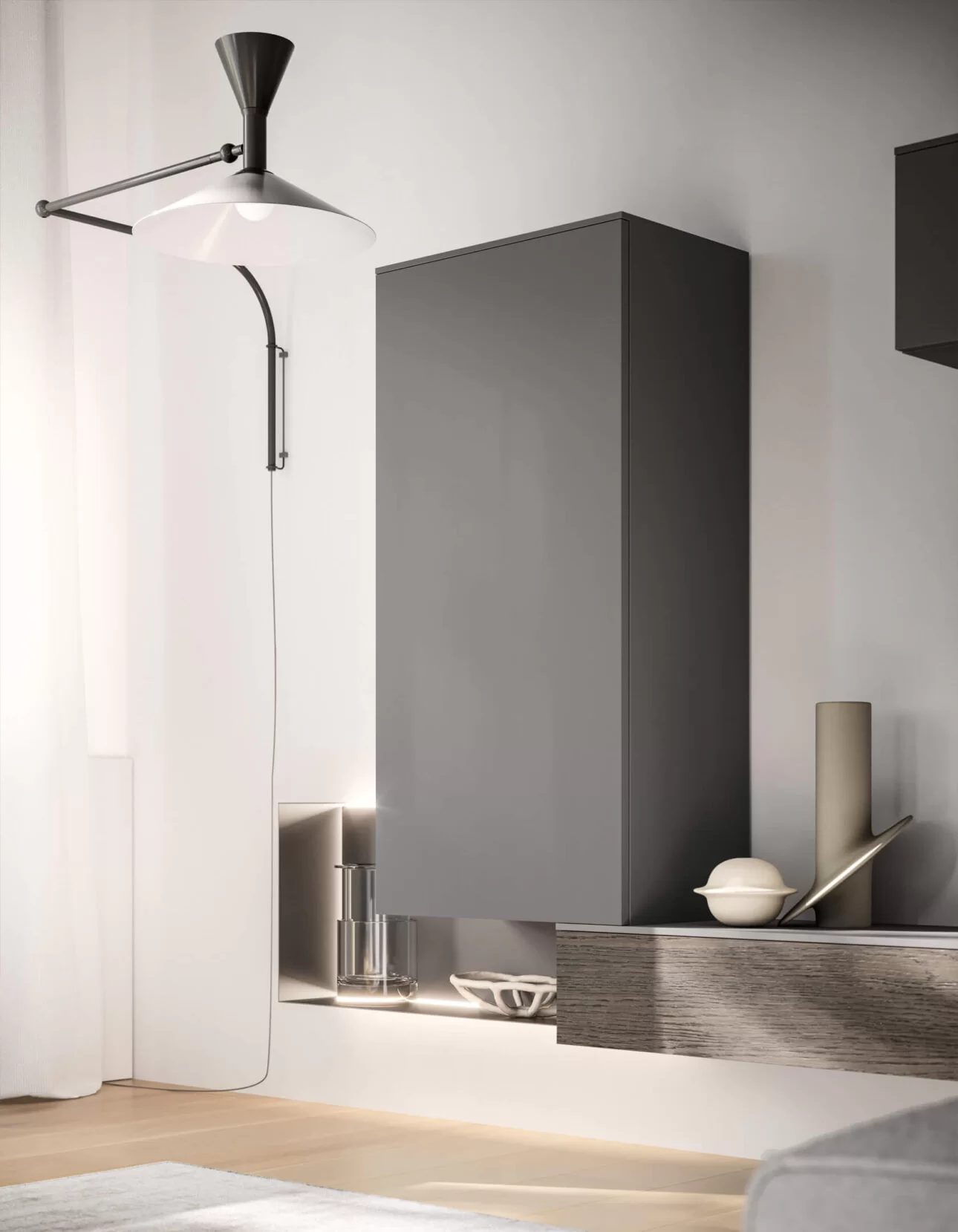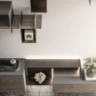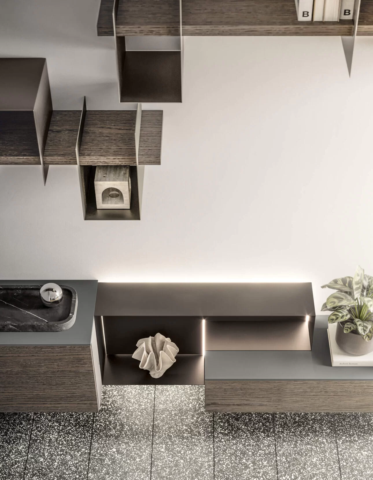 A dynamic, geometric composition featuring base and wall storage units in several sizes and finishes slotted into backlit metal units. The open metal modules can be used as an end unit in a composition, but also work well between two base or wall units to break up the rigorous linearity. The color can be customized. The Lamina elements – whether positioned facing upwards or downwards, on a 35-thick shelf – evoke the metal modules built into the base units, only on the wall. They are perfect for adding movement, and creating an original, light touch.