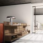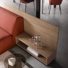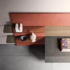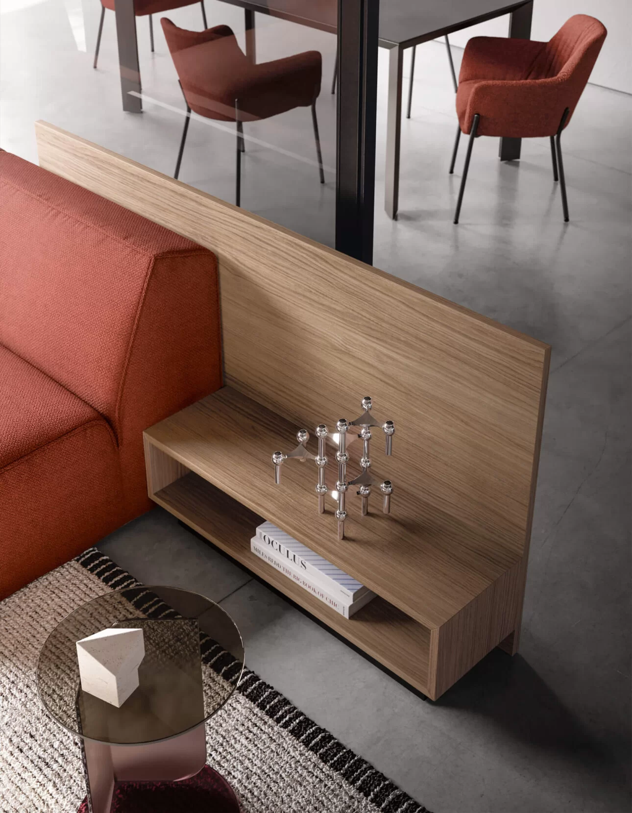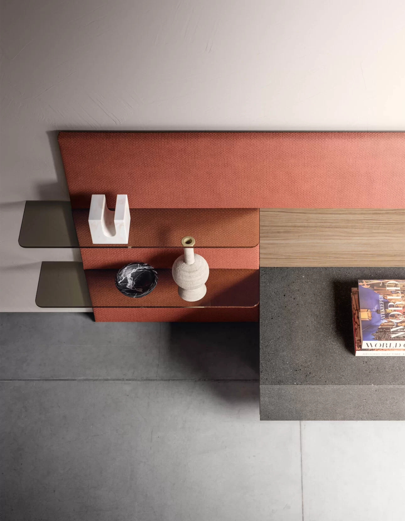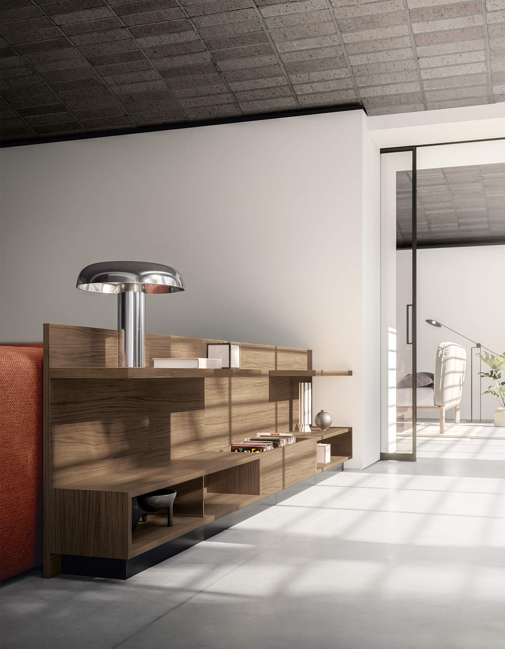 A modular composition with a flexible design, bringing together elements from two different Homy collections: Scacco and Evan. In Scacco compositions, base units and other elements are built into paneling in different sizes and finishes, while accessorized paneling finds its place in the Evan designs. Different modular designs facilitate and optimize how you furnish fully open living spaces, even where compact. Modular paneling behind the sofa can be positioned freely along the back or positioned next to a wall, to shake up how you organize your space to suit your needs.