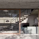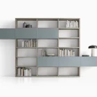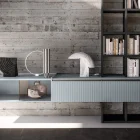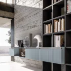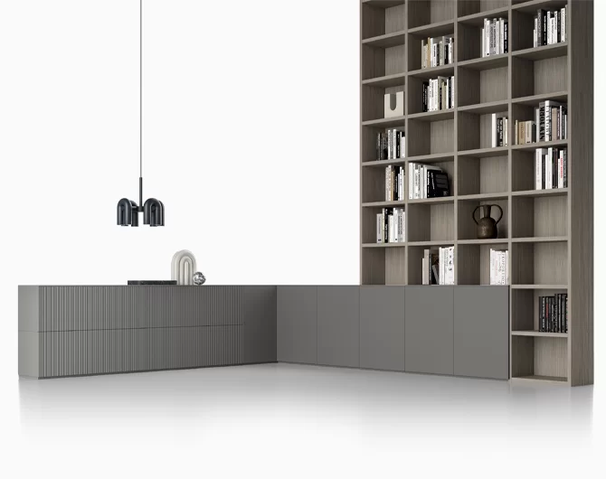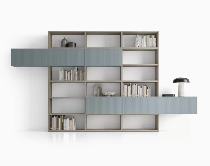 A composition with an ultra-light look combining a wall-mounted base unit and a bookcase with open compartments. The Grecato finish creates a fluted pattern you can customize in different