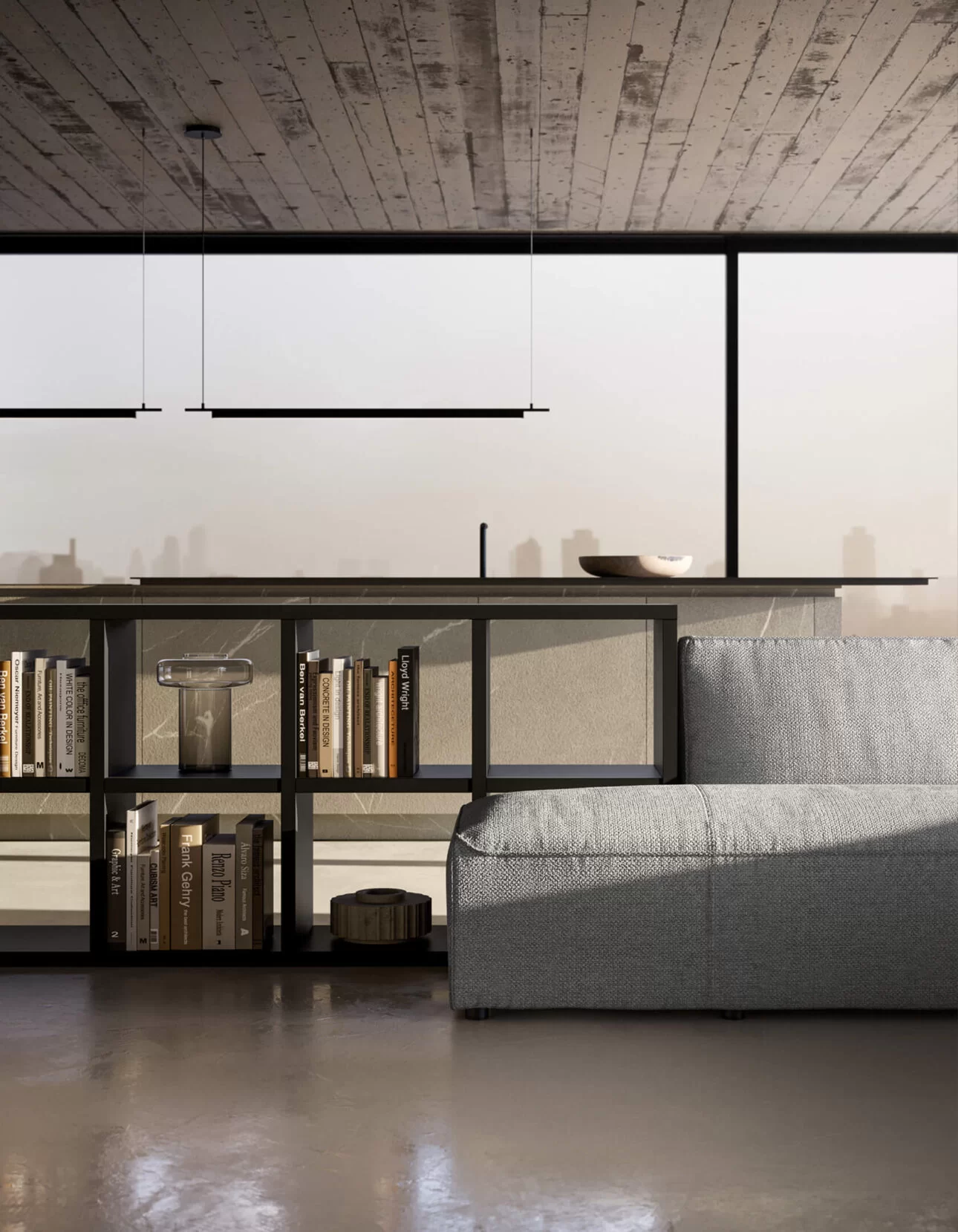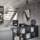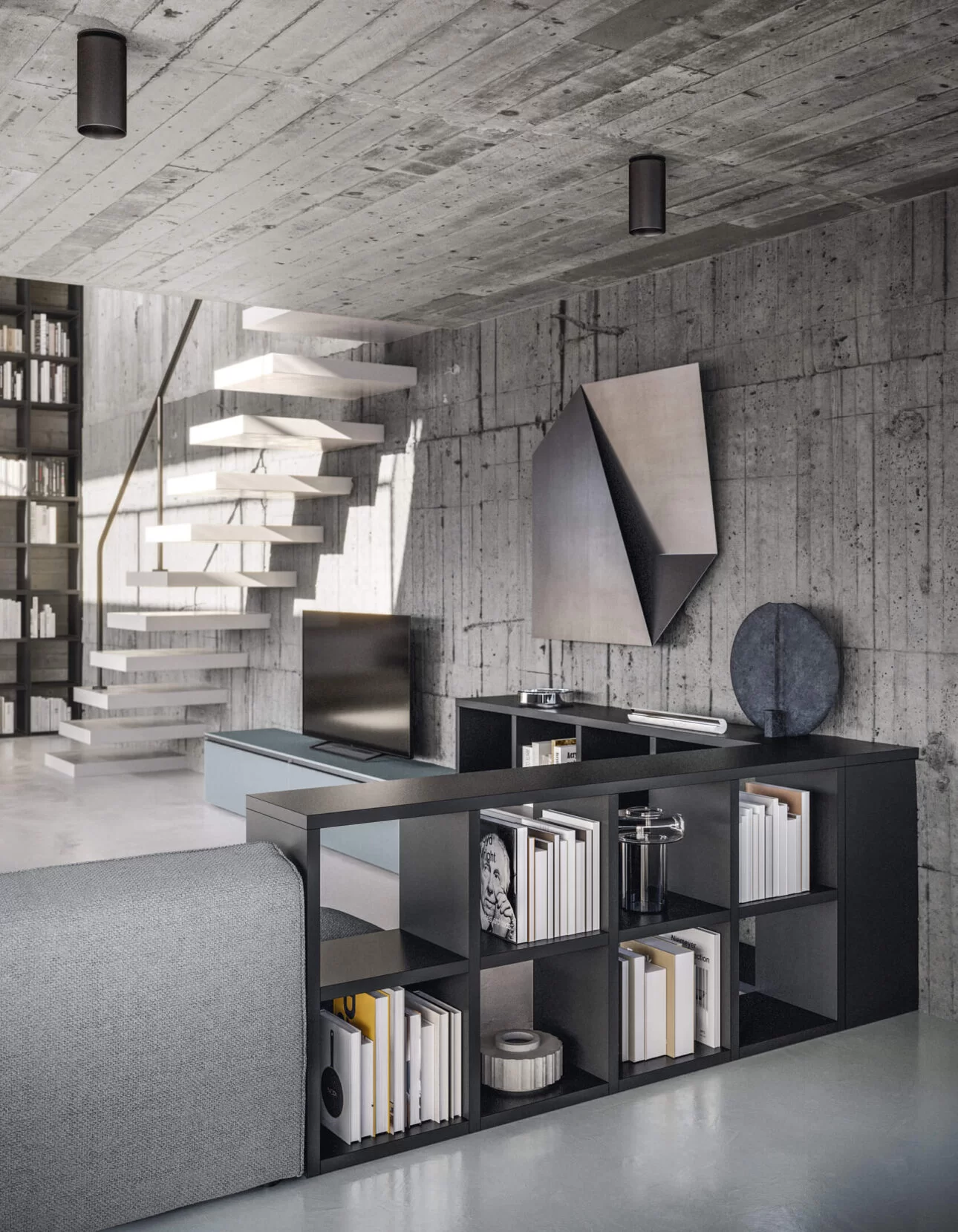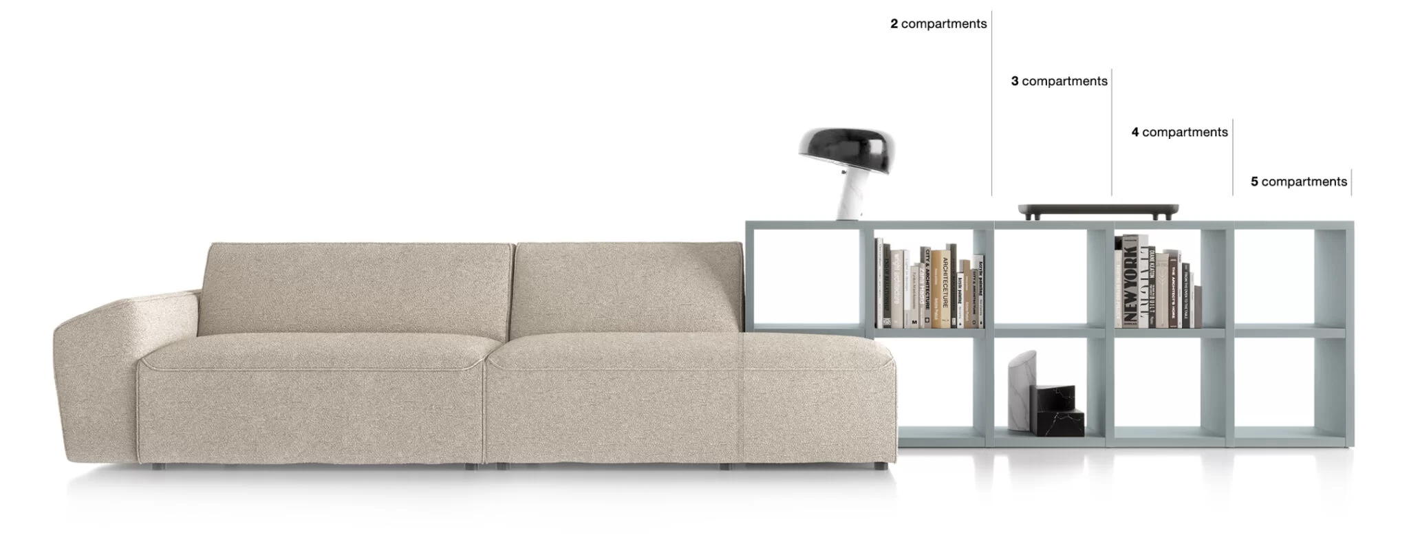lacquered colors. It decorates the unit surfaces with a 3D relief design: an original, creative way to furnish your home. The Evan range brings new designs concepts to your living room compositions: add a double-sided bookcase to your sofa – you decide the width.