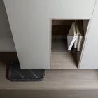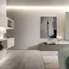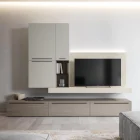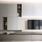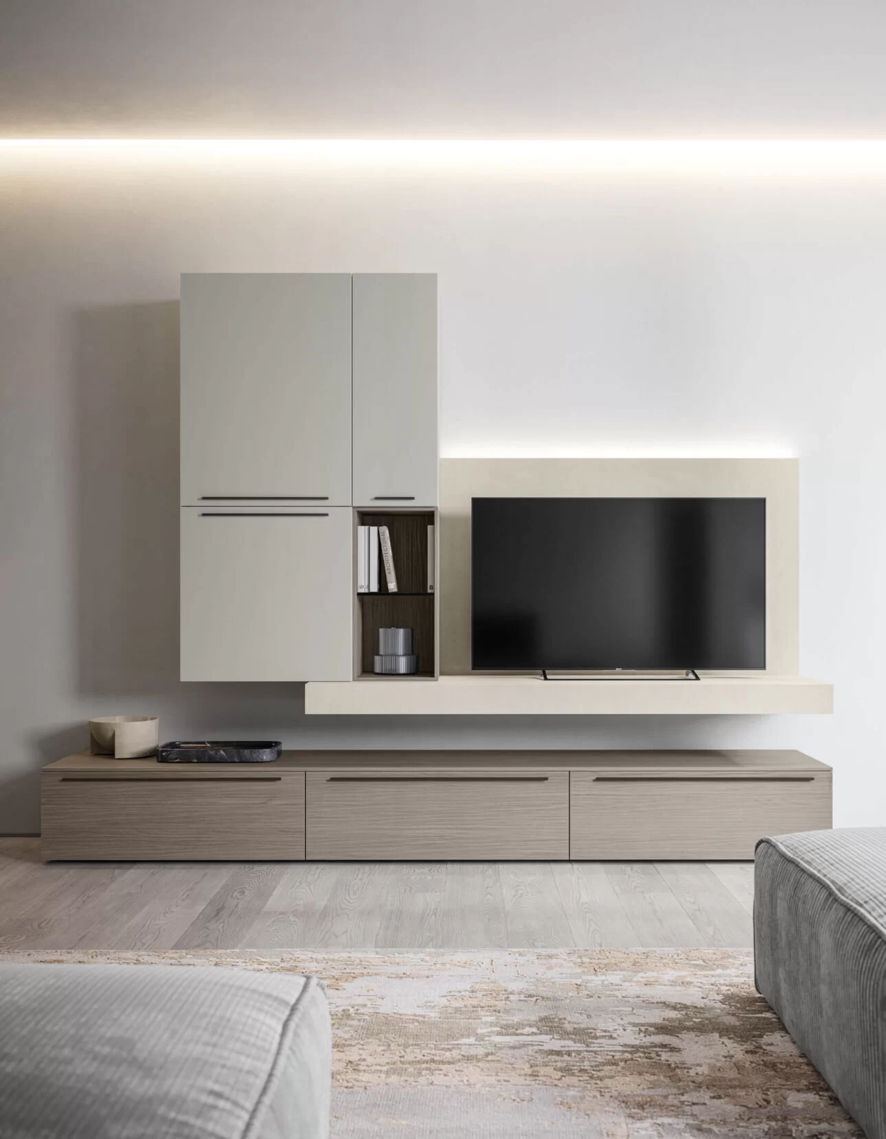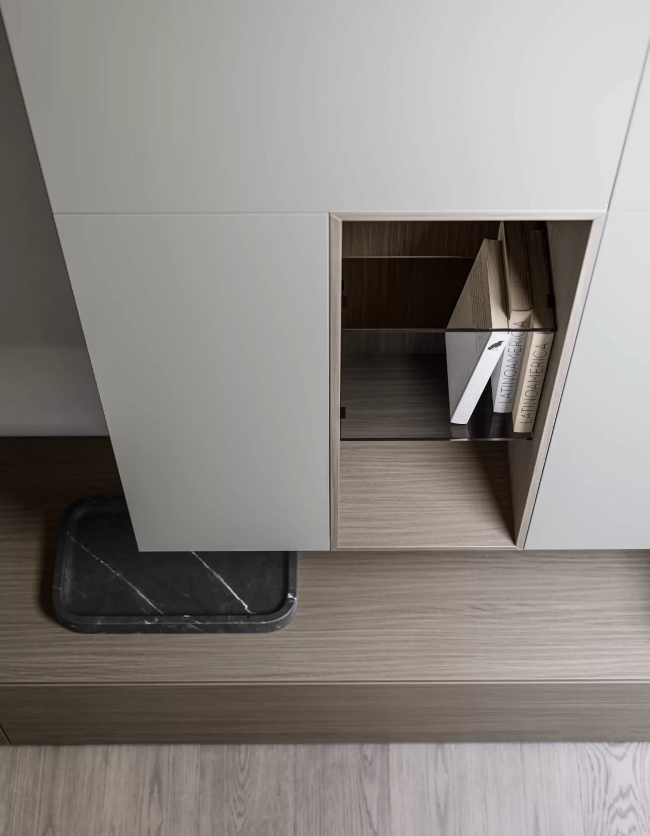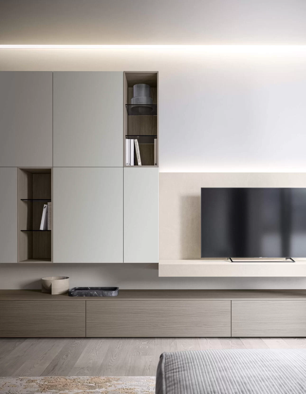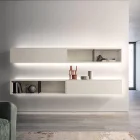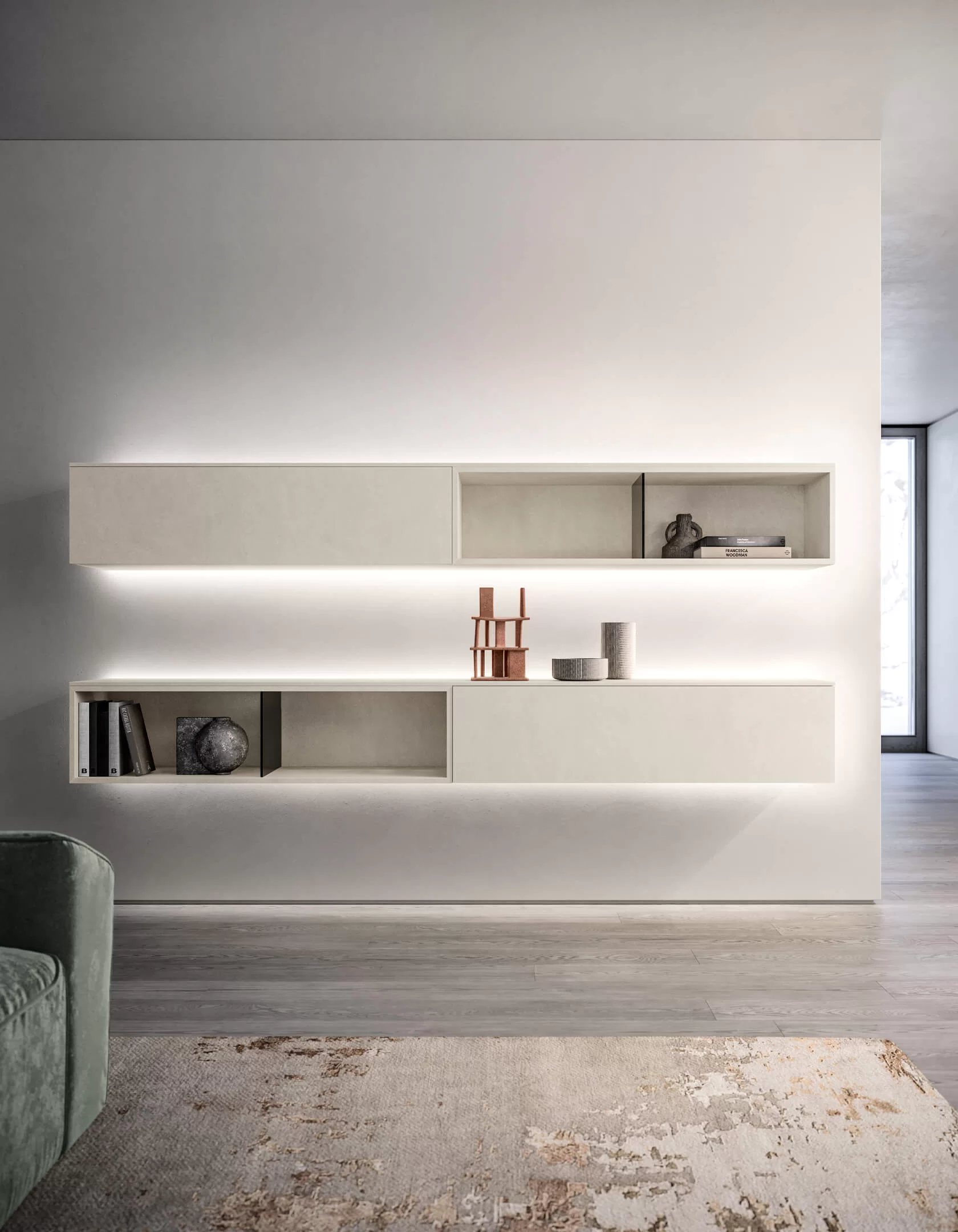 This composition extends lengthways, with linear base units to match the wall units. They feature open and closed compartments, and the Cento shelf for the TV. The wall paneling and chunky shelf share the same finish and, together, make up the TV space: a practical yet decorative solution. Each element is available in a wide variety of sizes and finishes, so you can furnish more compact spaces with the same units, too. The proportions change but not the practicality! Backlit wall units complete the living room composition and are built into maxi open units. Smoked glass partitions divide up the space and add to the aesthetics of these pieces.