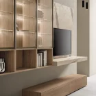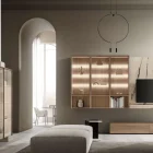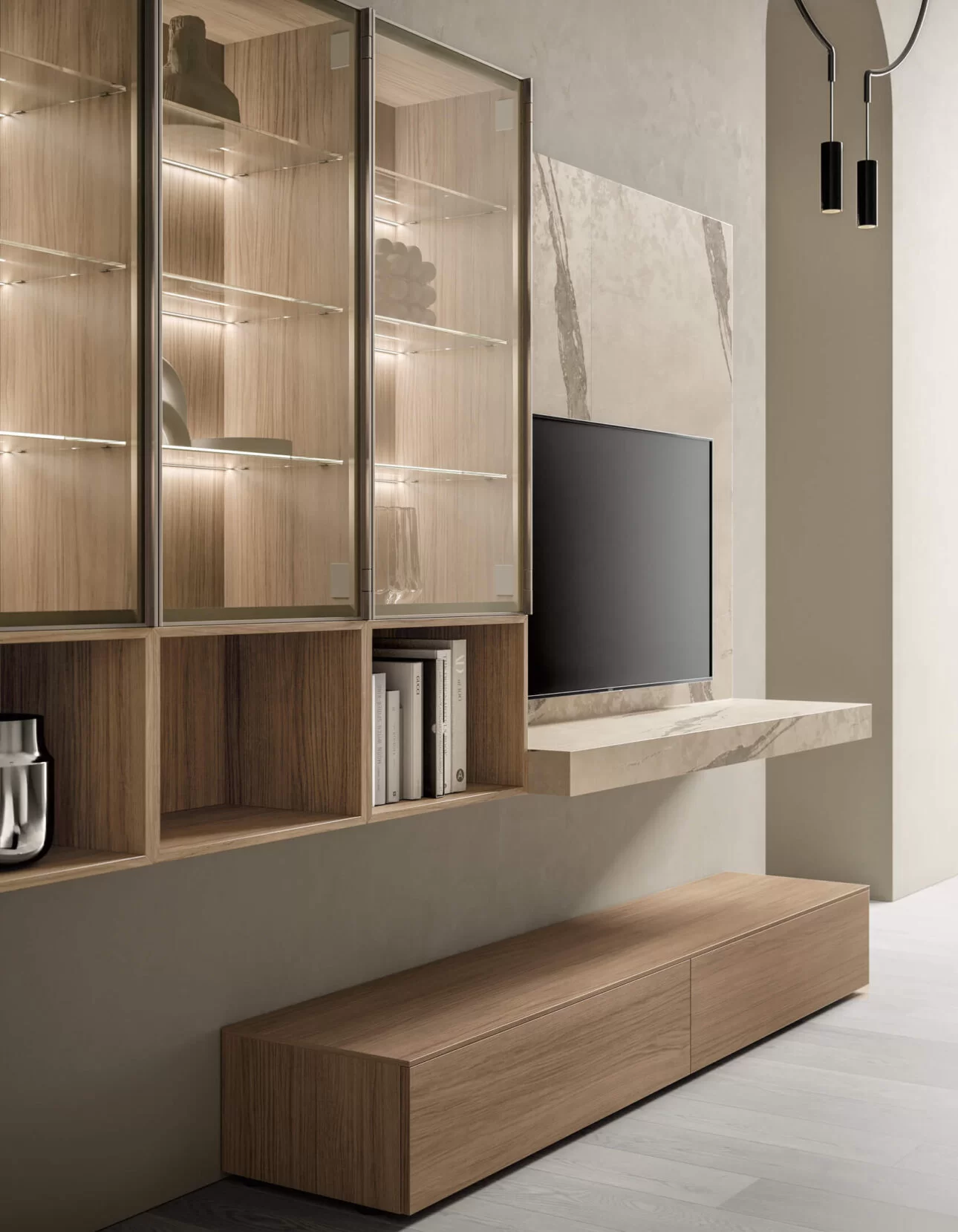 The floor-standing base units, Cento shelf with wall paneling, display units with Luxury doors, and open units together make for a compact composition. The living room is small in size but big on style: as well as customizing the aesthetic details, you can also configure your living room by adapting each individual piece to the available space.