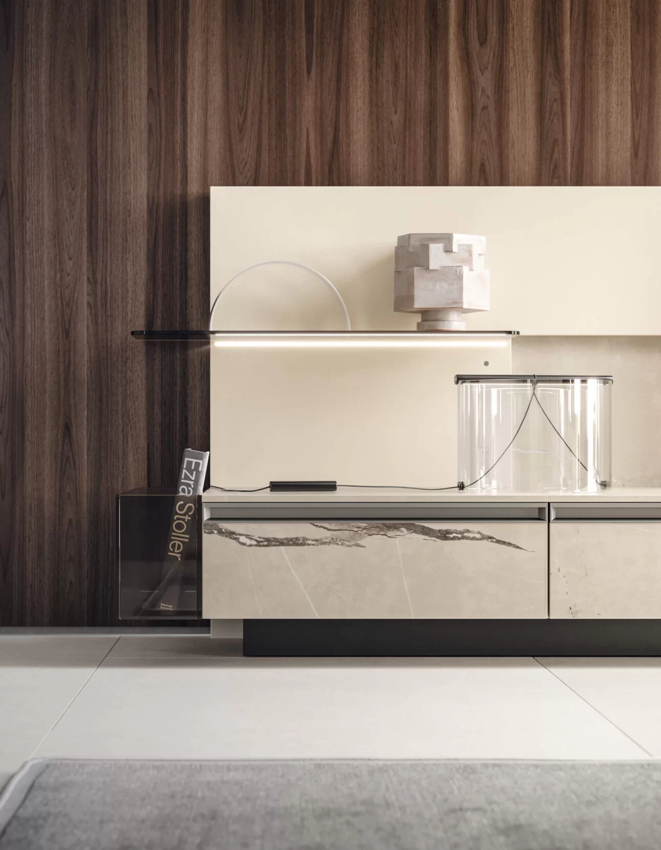 LED lighting and textured finishes: Scacco Living is ideal for creating linear compositions with stand-out style. The Scacco Double composition plays with the hallmark L-shaped elements to create a symmetrical design with a more distinguished feel. It comes in two different sizes: W. 2448 and W. 3672.