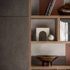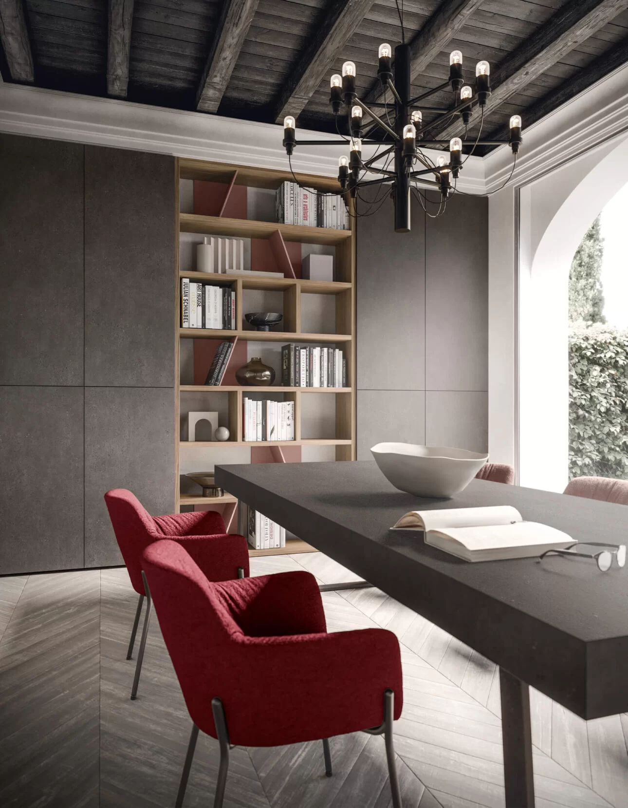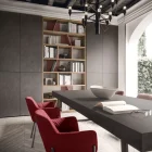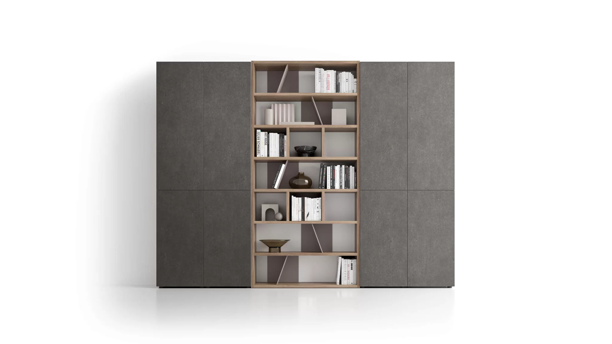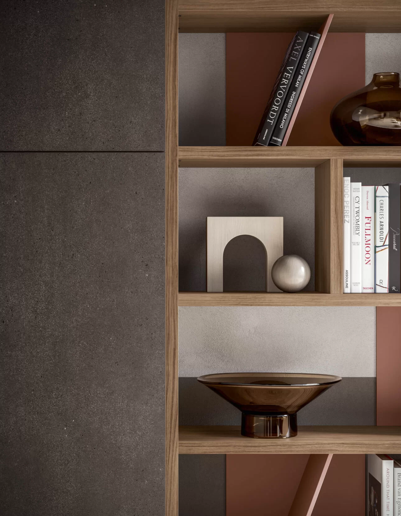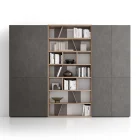 Spacious wall units with hinged doors are positioned alongside the bookcase structure with open compartments: this mixed furnishing solution emphasizes the contrast between full and empty spaces. Texture and color are well balanced in wall composition offering plenty of space for storing and displaying your possessions.