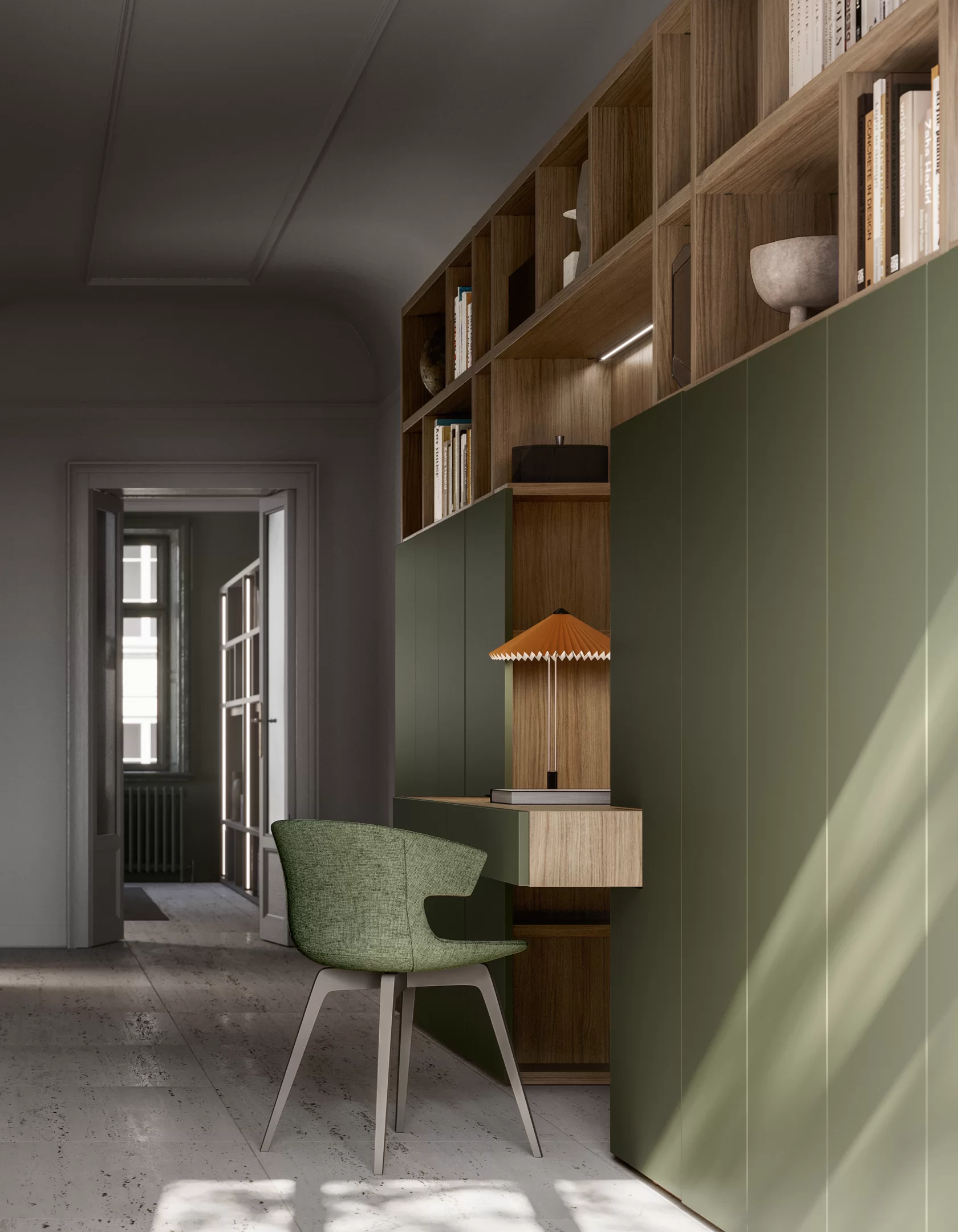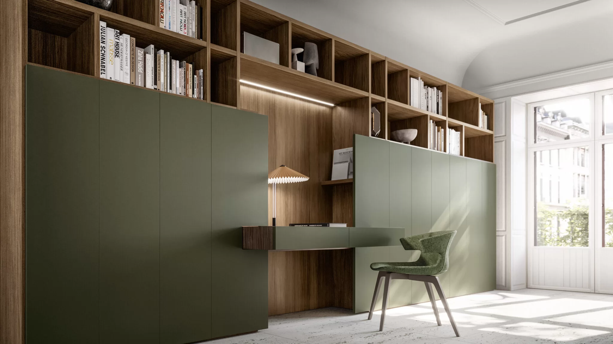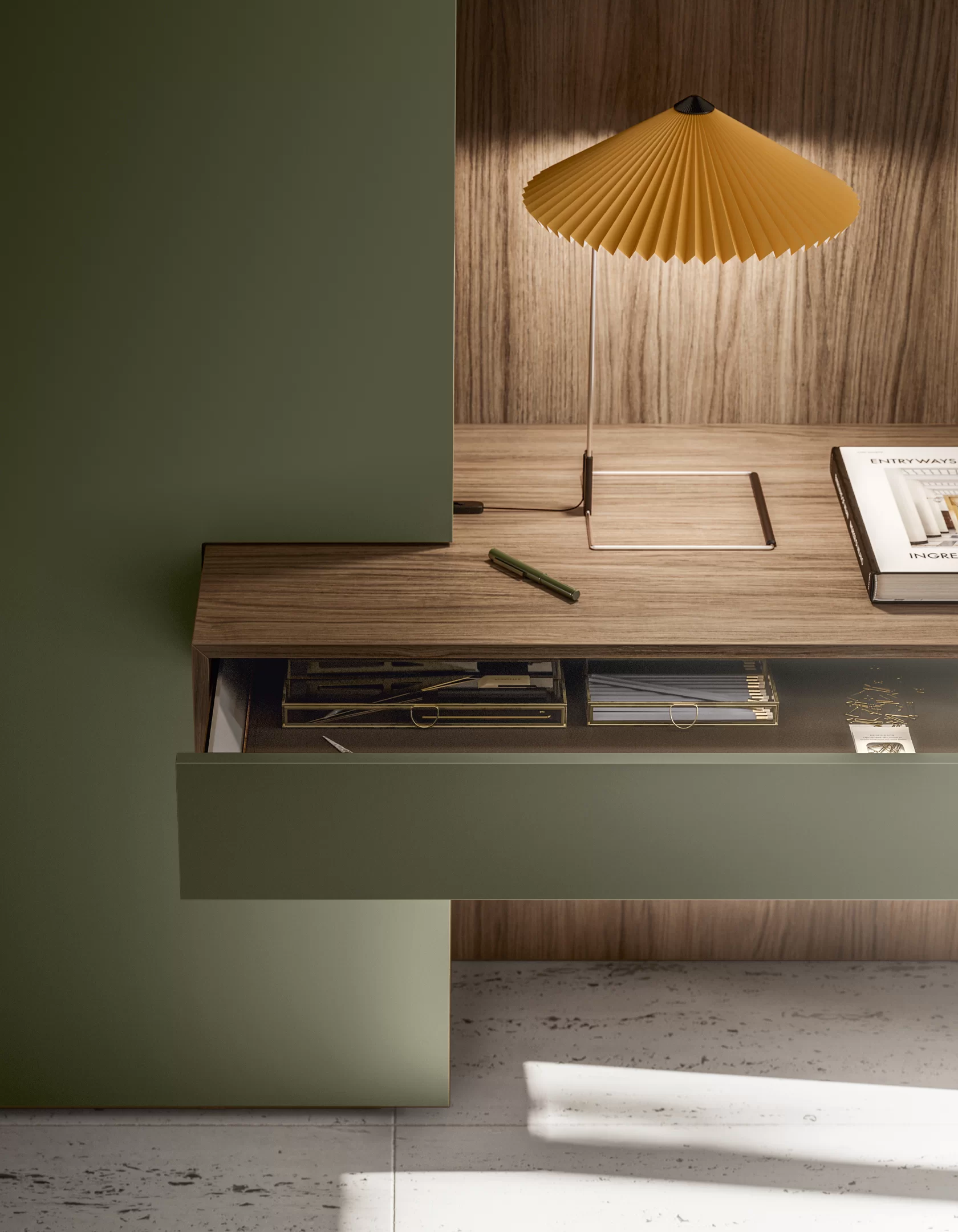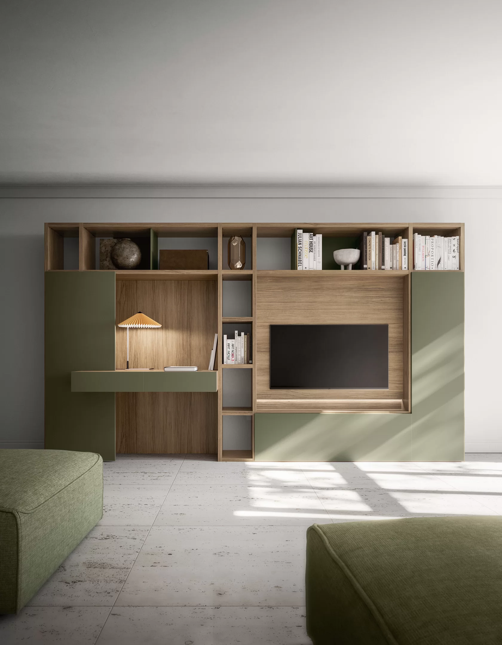 Much more than a bookcase, this piece creates an organised, multifunctional wall composition to accommodate your TV, plus a home-office workstation with a cantilever desk. This is the perfect way to create a study or remote-working area in your living room, or in another room in the house. The Free cantilever desk top has two drawers to make staying tidy easy, while the lighting built into the bookcase ensures the area is well lit.