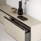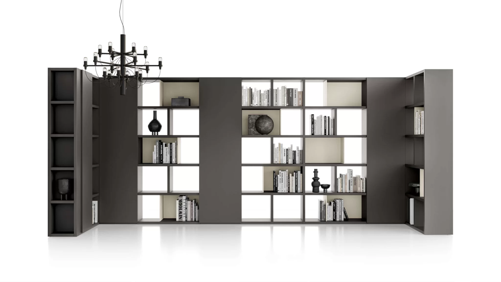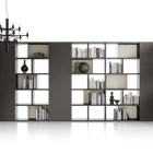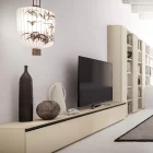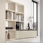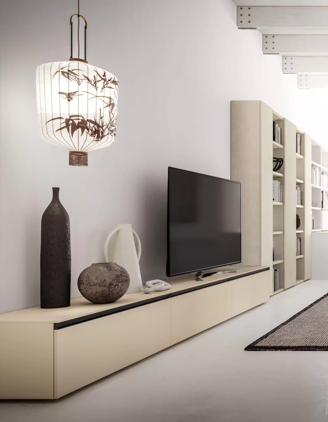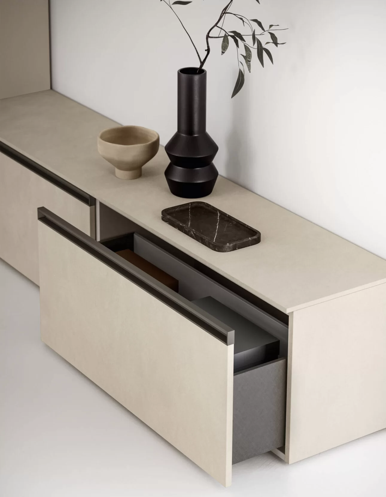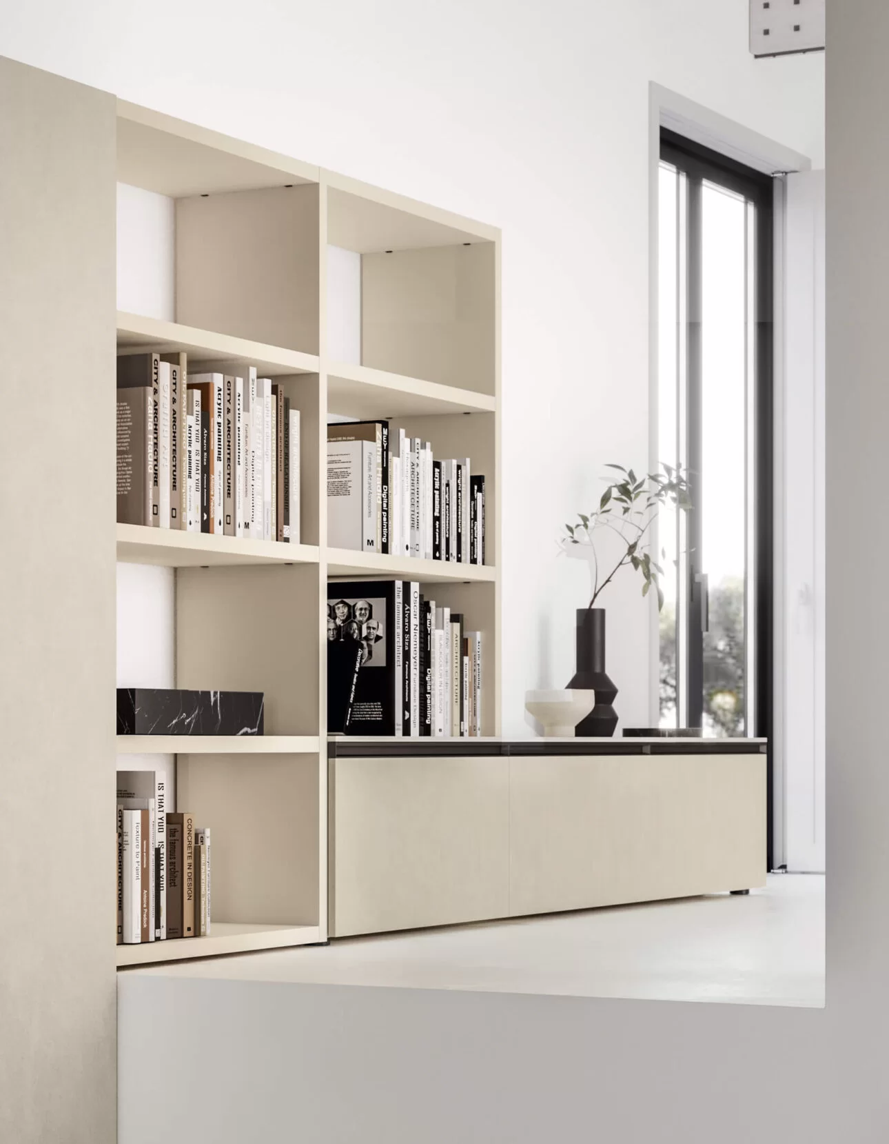 A living room composition made up of a floor-standing base unit with drawers, and a bookcase featuring open compartments of various sizes alternating with vertical units with hinged doors. The groove handle in a dull metallic Titanio finish is the hallmark of the Ego units; this design feature represents the essence of this unique range, perfect for any room in the house. The floor-standing units have a levelling foot, adjustable from the inside, while special runners mean the drawers can be fully pulled out.