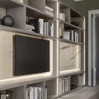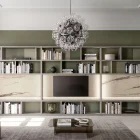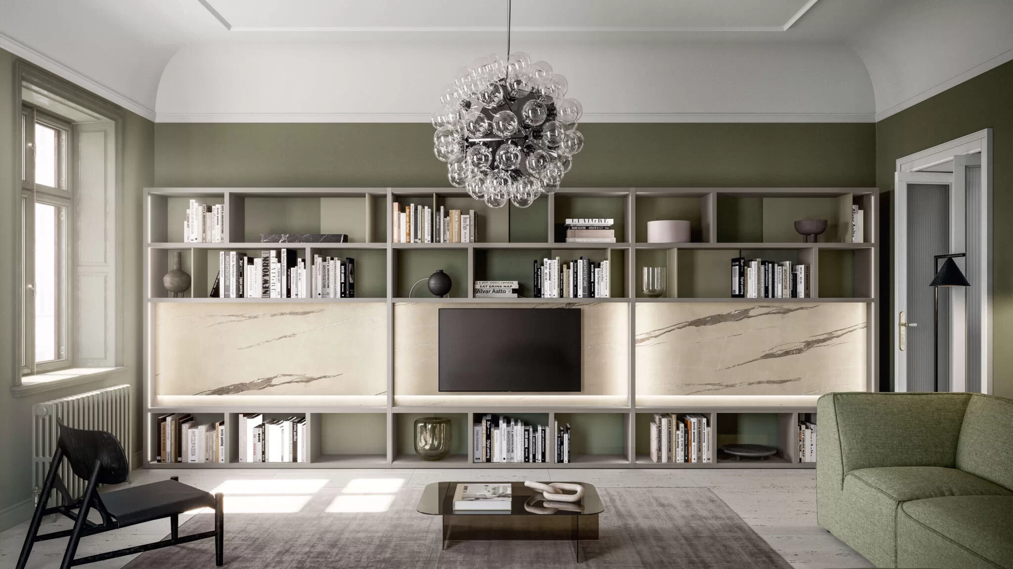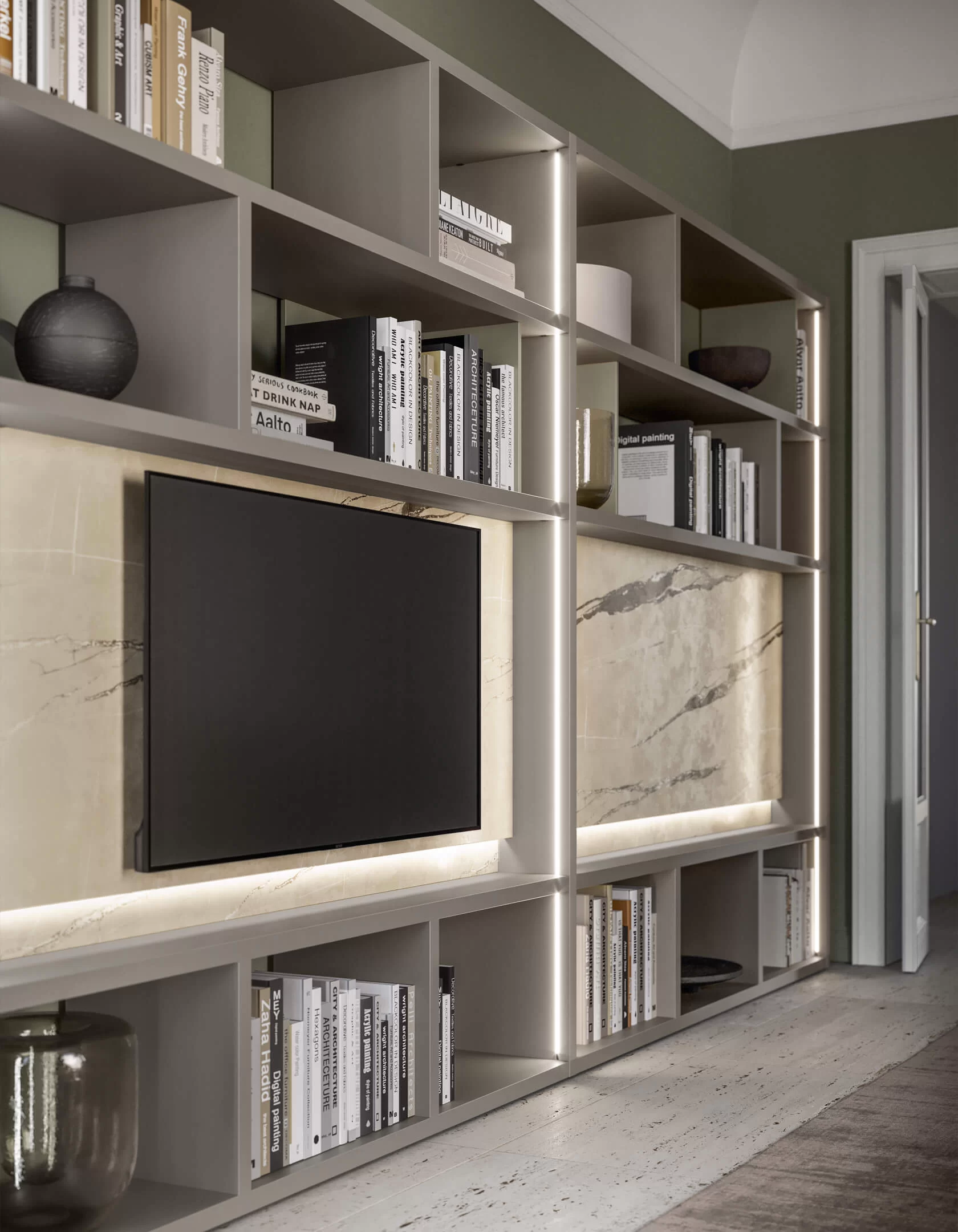 A bookcase to furnish the entire wall, offering open storage compartments in different sizes, some finished with textured backs, others with colorful File dividers. The bookcase has built-in lighting in the form of LED strip lights along the front or rear edge of the compartments, creating a practical feature and focal point.