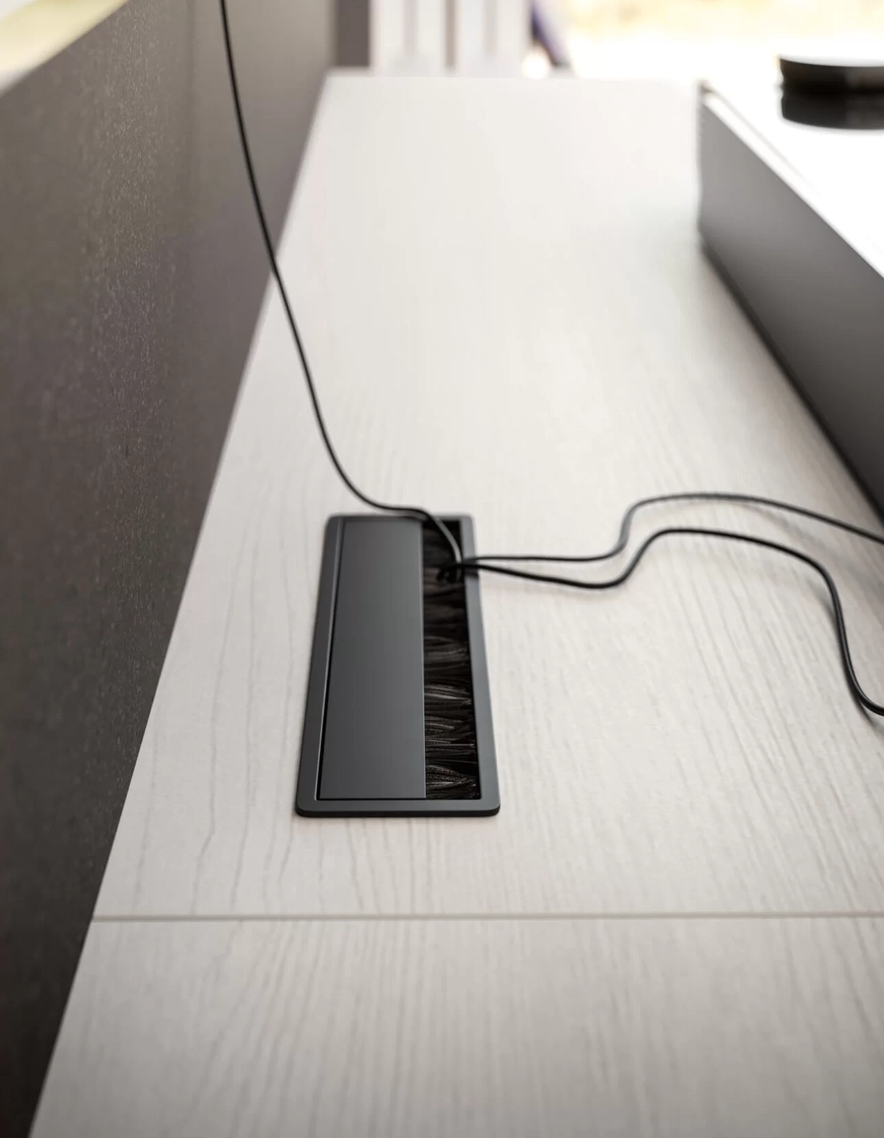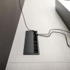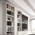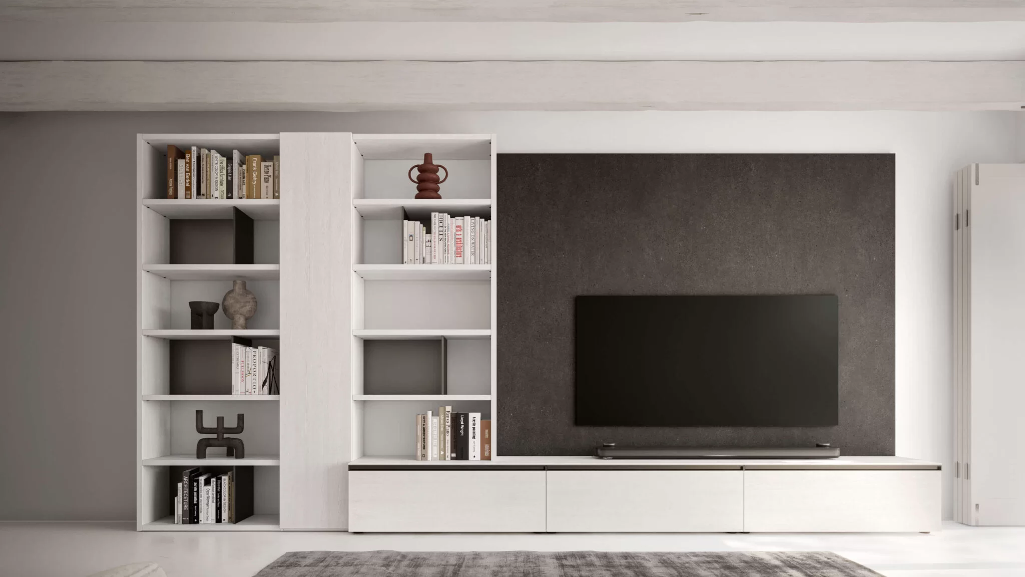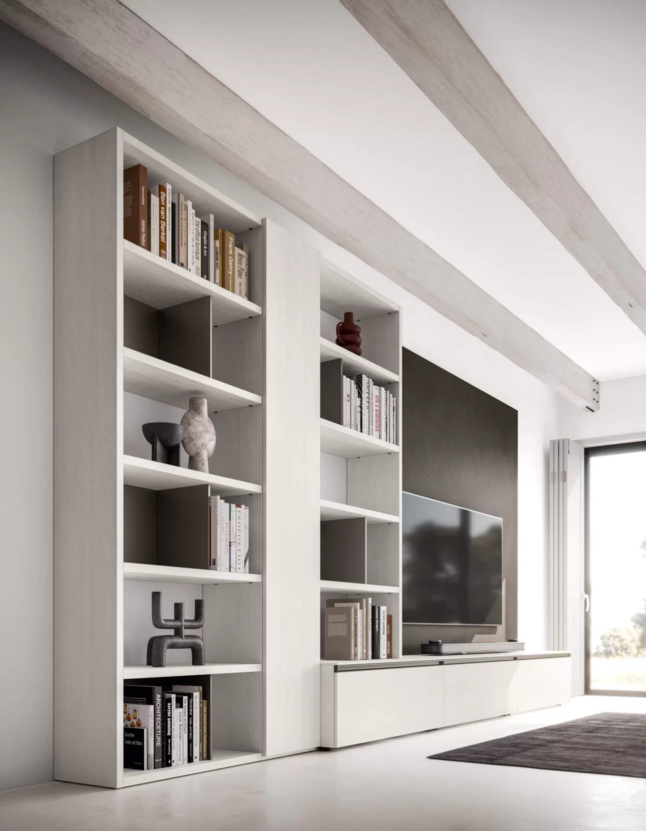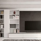 The tall storage unit has an open bookcase on either side, one of which is built into a floor-standing base unit. Wall panelling to support the TV completes the look. The floor-standing base unit with a different depth extends beyond the storage unit and bookcase, while the top features a discreet square or rectangular wireway.