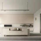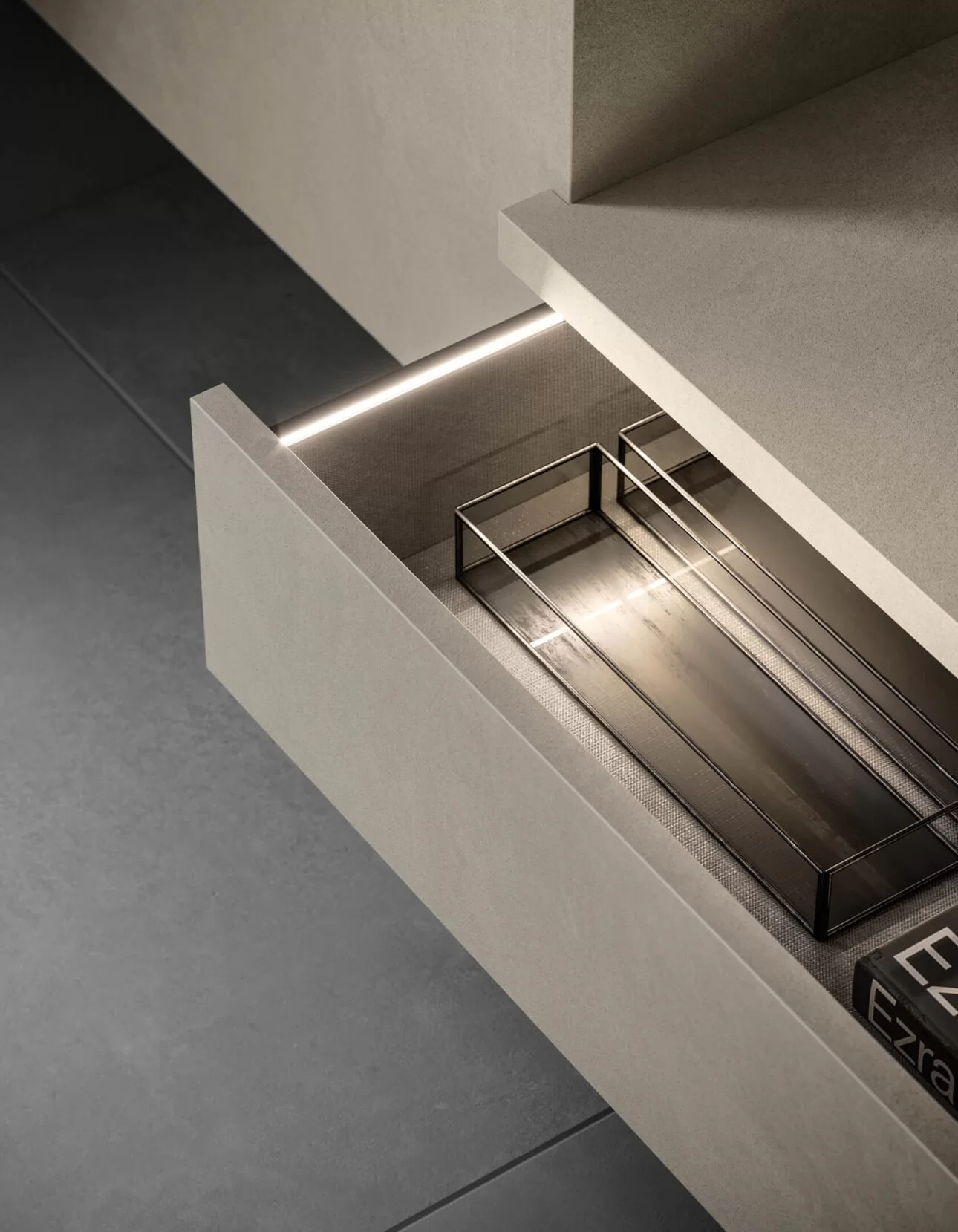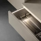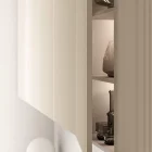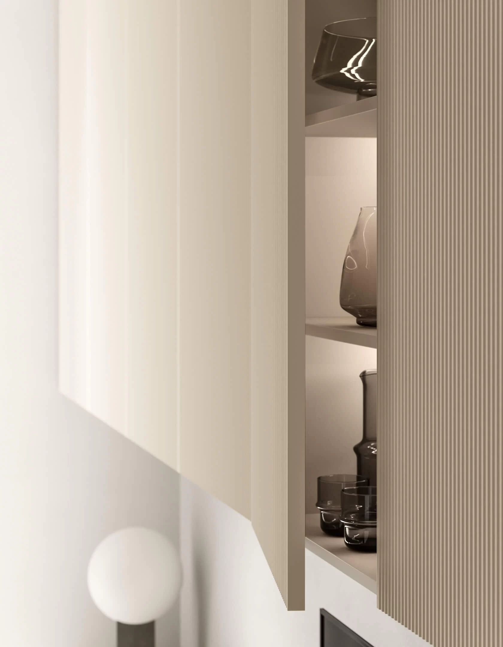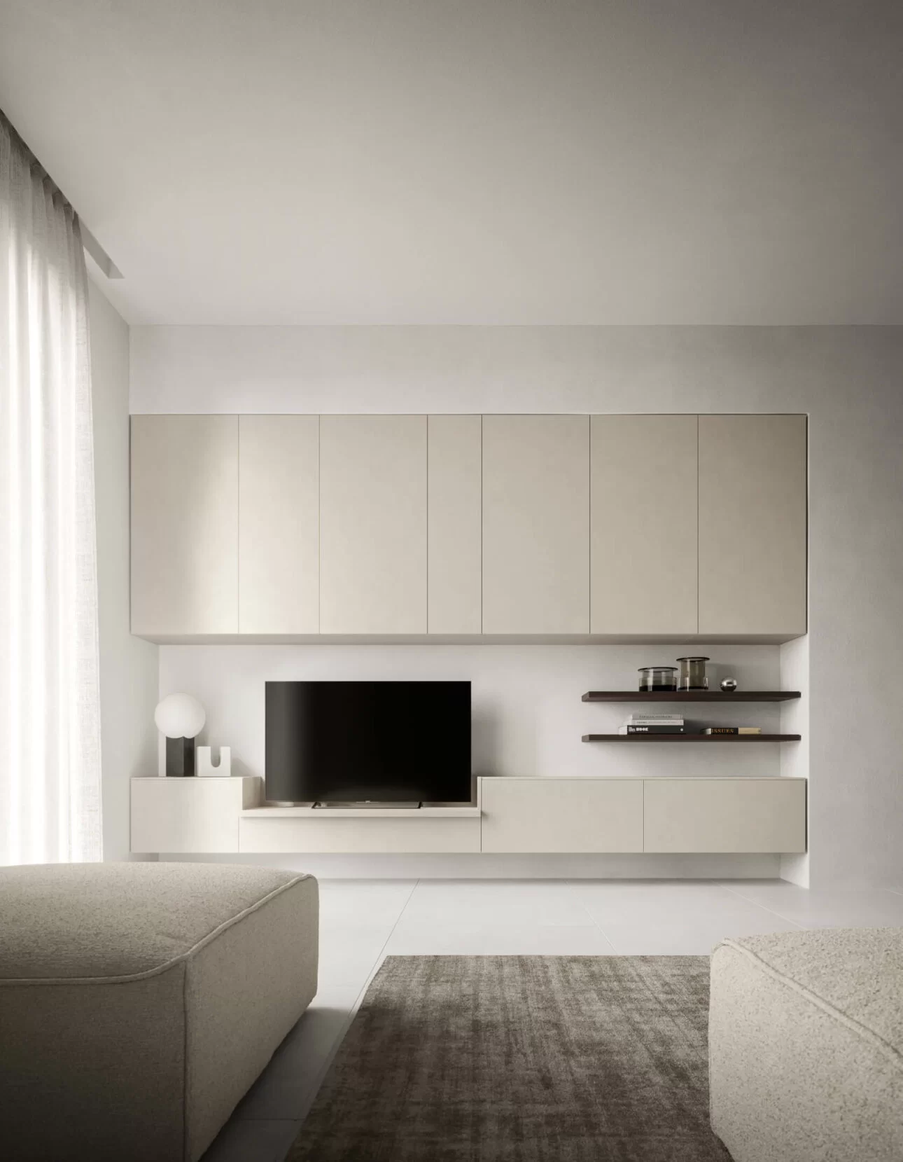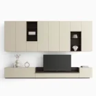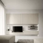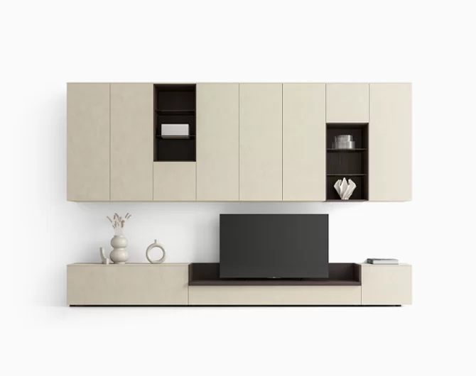 A living room composition combining a light wall-mounted base unit with TV tray and shelves, with compact wall-mounted storage units. The fluted effect on these wall units is created by milling the 22 mm thick doors. Available in a selection of sizes, the door is customizable in the full range of lacquered colors. Transform a series of modular elements into a single, capacious sideboard with a coordinated look by adding the TV tray design shown here in the delicate Champagne finish to match the support brackets.