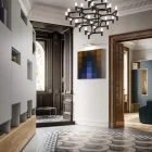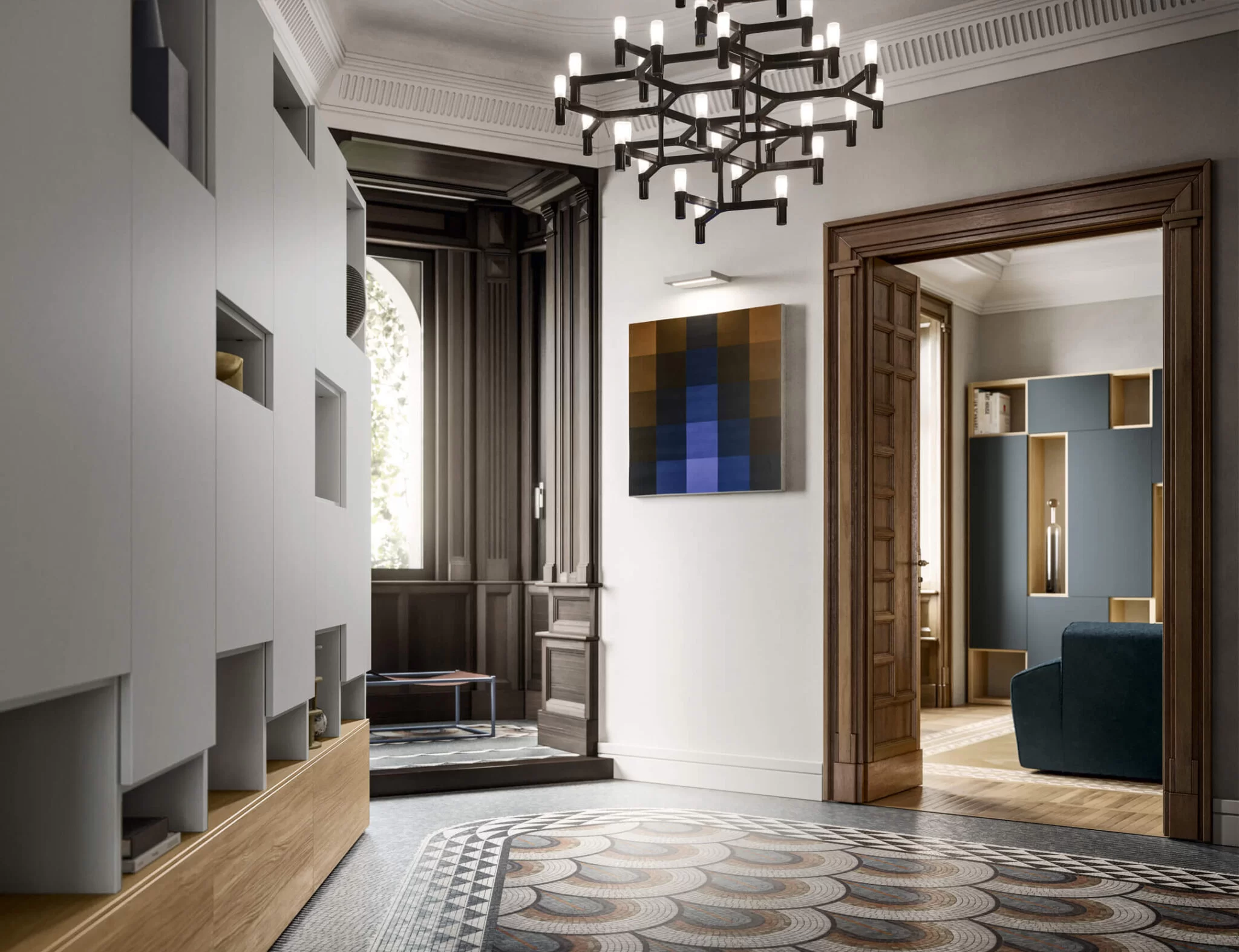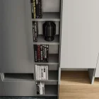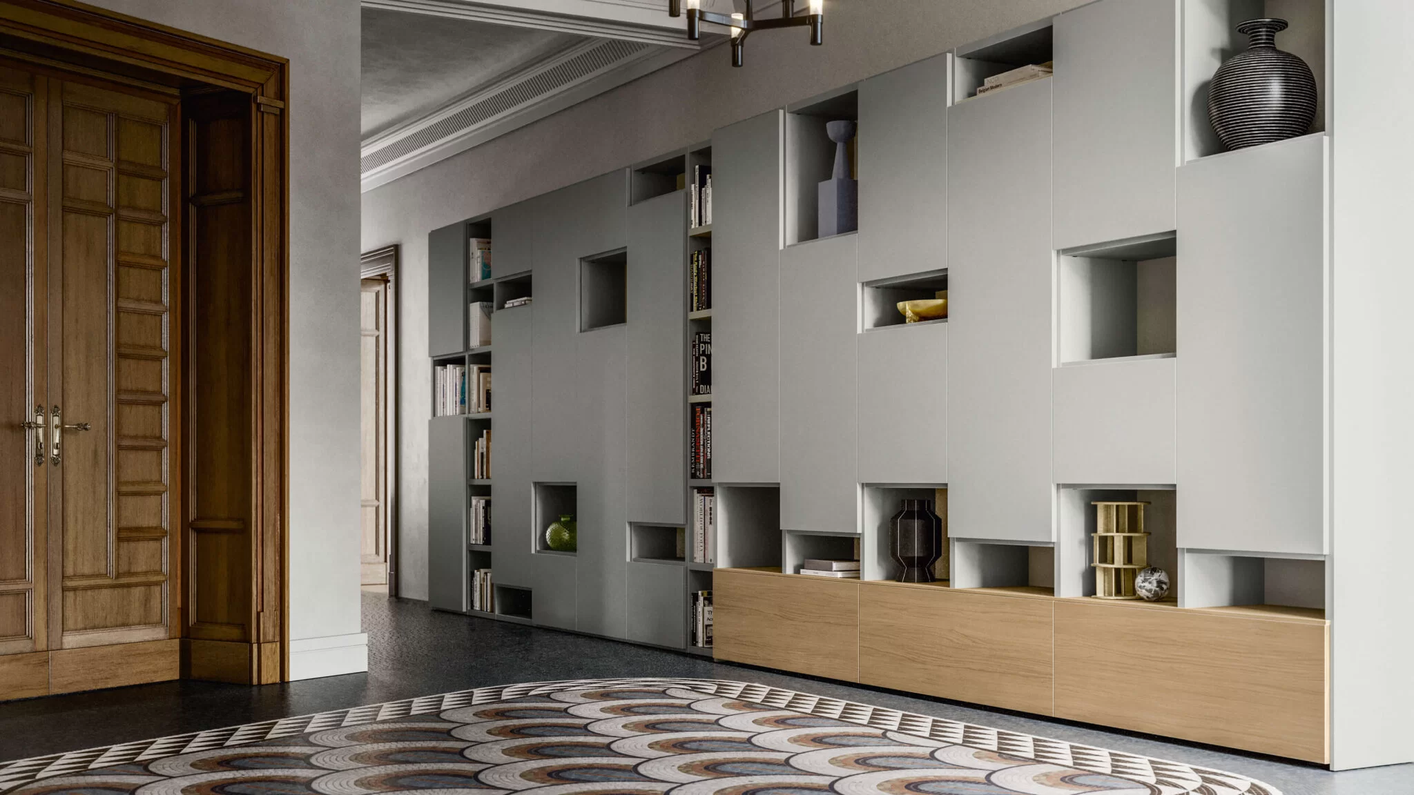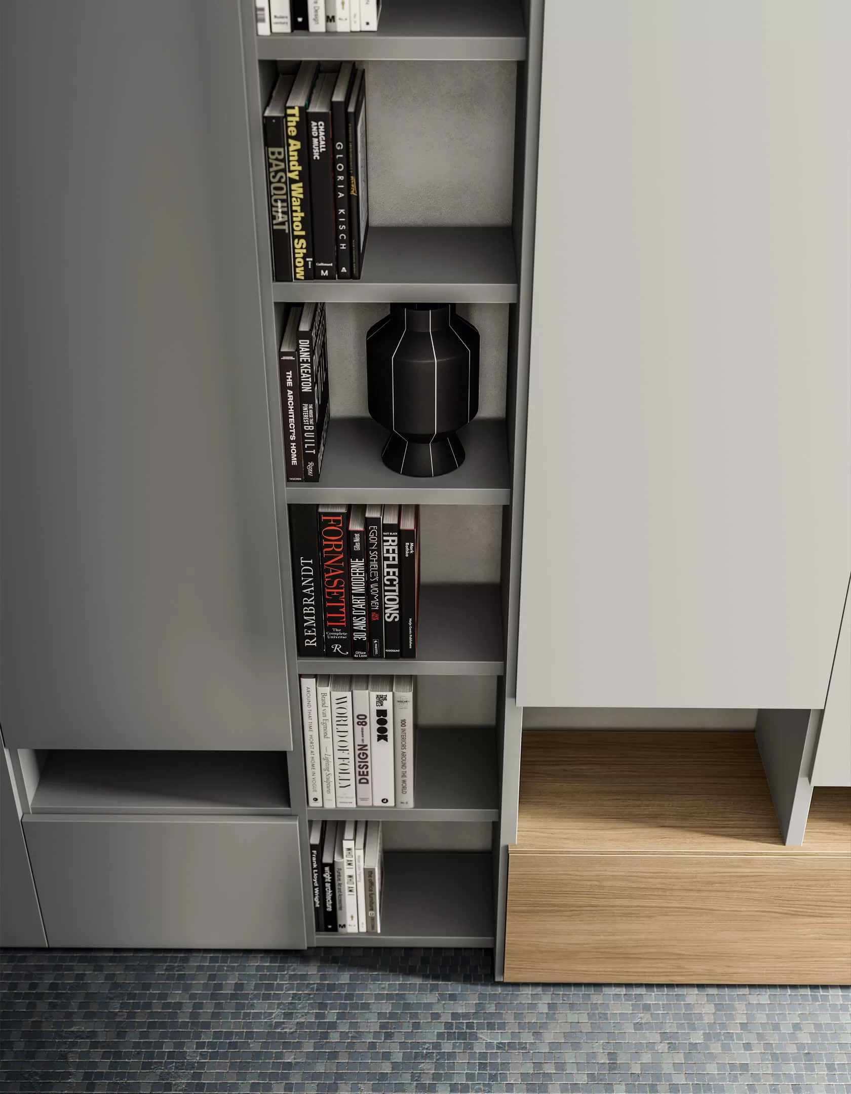 A bookcase boasting different depths that adapts to the most difficult spaces, it comes in a mix of finishes and materials, with both open and closed compartments. A difference in depth between the side panels can help solve critical design issues: 100 millimeters make the spaces more functional, e.g. in hallways and passageways.