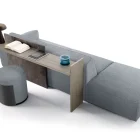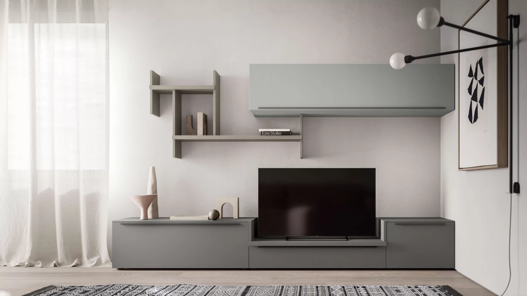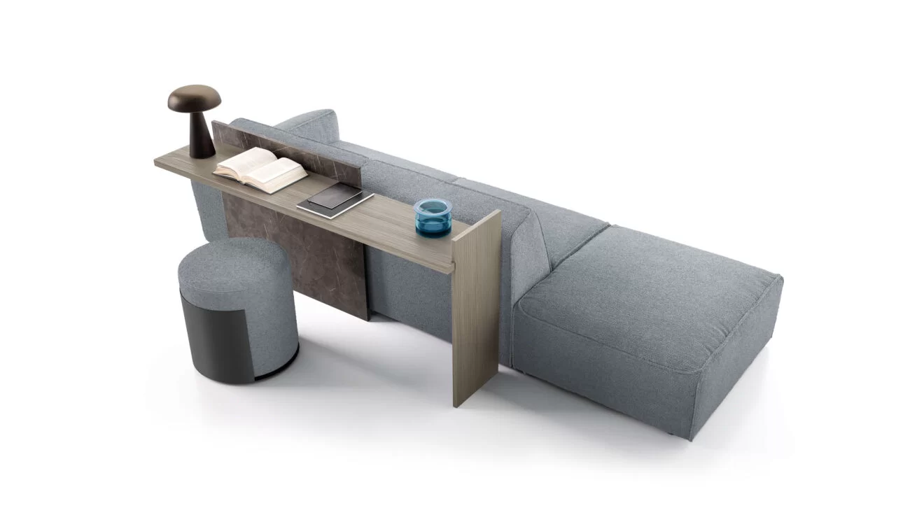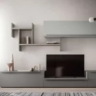 A living room composition defined by the Akka collection TV unit and shelving. The Akka organizer desk is hooked onto the Evan sofa, which acts as its supporting structure, to create a practical, free-standing design that saves on space.