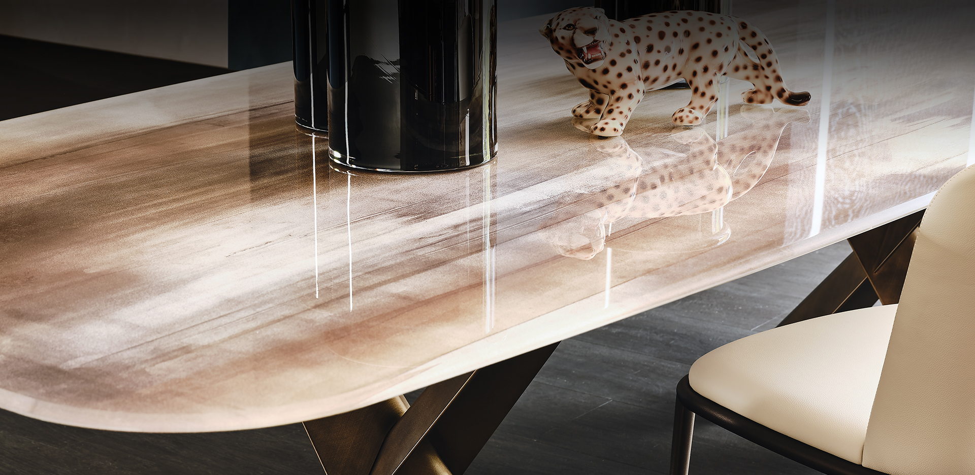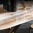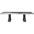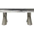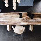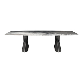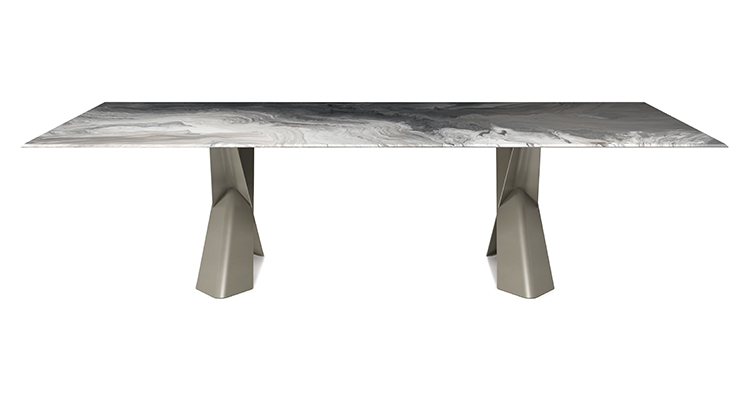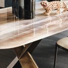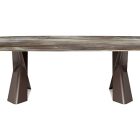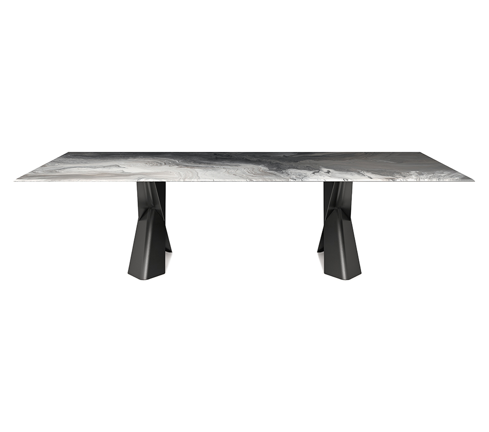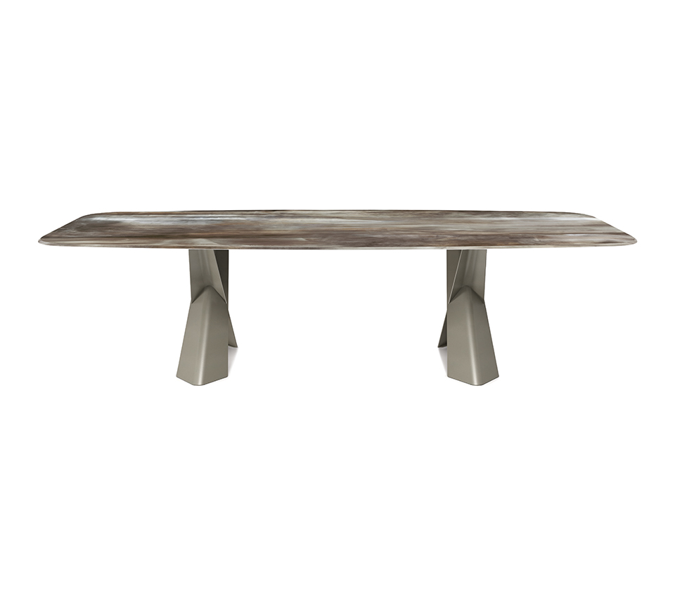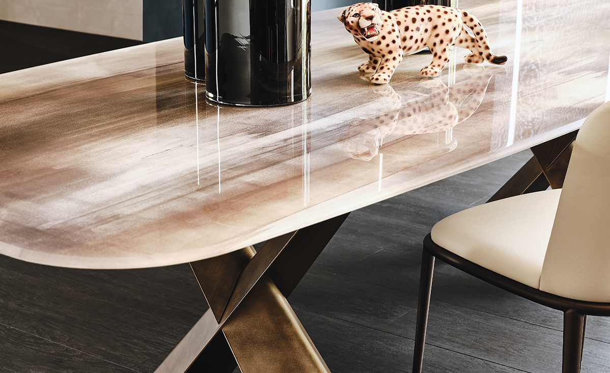 The modern tables in the Mad Max family give the dining room an inimitable, refined style. Simplicity and originality are perfectly balanced in the design of this design table, which is a timeless piece of furniture. The steel base forms two parallel Xs and supports the top in the refined versions available. Mad Max Wood is a wooden table the tops of which can be customised: with oblique or irregular edges for a more natural, wooden effect, with barrel top with beveled edges or with a rounded and painted lower frame. Or in the Masterwood version with wooden top with a richly detailed design, diagonal strips and shaped edges. Mad Max Keramik and Mad Max Keramik Premium have a top in different shades of refined ceramic, the second has a thick edge embellished with a hand-brushed finish.Lastly, Mad Max Crystalart is a glass table with a charming decorative art print.