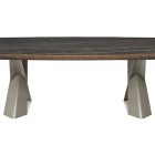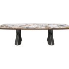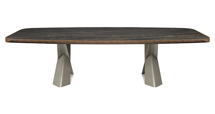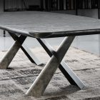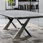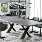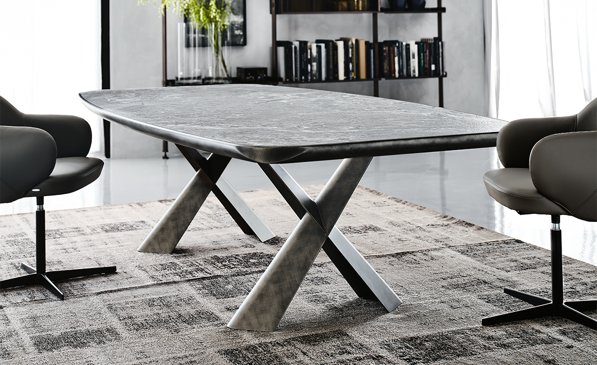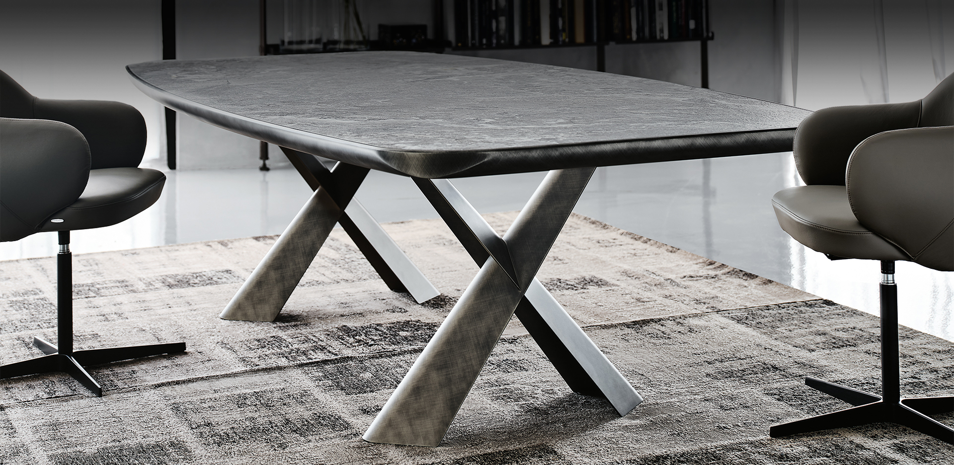 The modern tables in the Mad Max family give the dining room an inimitable, refined style. Simplicity and originality are perfectly balanced in the design of this design table, which is a timeless piece of furniture. The steel base forms two parallel Xs and supports the top in the refined versions available. Mad Max Wood is a wooden table the tops of which can be customised: with oblique or irregular edges for a more natural, wooden effect, with barrel top with beveled edges or with a rounded and painted lower frame. Or in the Masterwood version with wooden top with a richly detailed design, diagonal strips and shaped edges. Mad Max Keramik and Mad Max Keramik Premium have a top in different shades of refined ceramic, the second has a thick edge embellished with a hand-brushed finish.Lastly, Mad Max Crystalart is a glass table with a charming decorative art print.