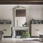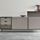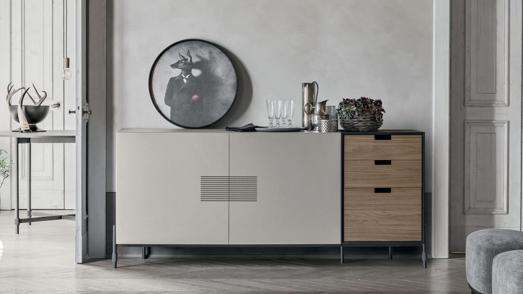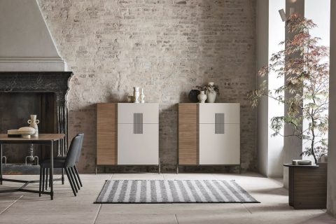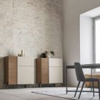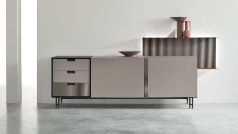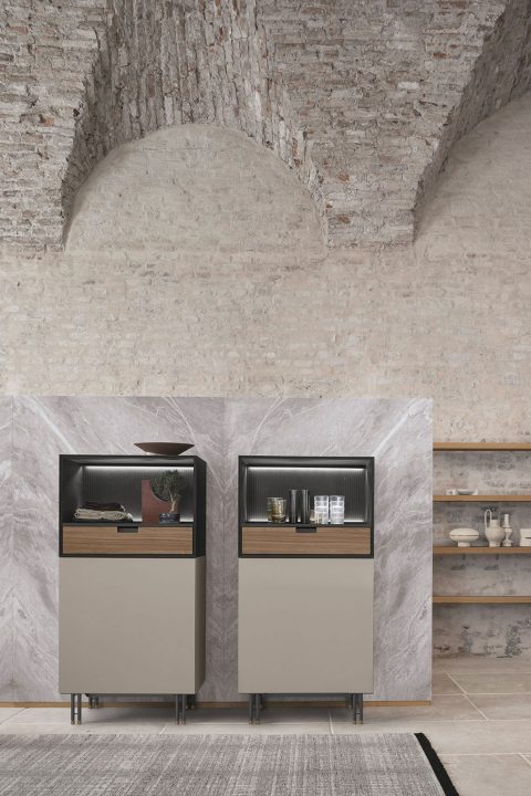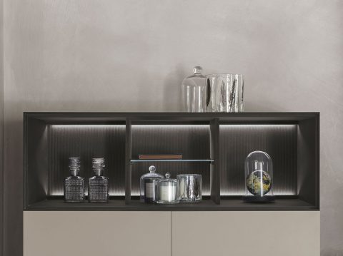 Sideboards Time M in arena CDF and veined black CDF. Open compartment in reeded in reeded veined black CDF with led light. Anthracite 160 metal base.