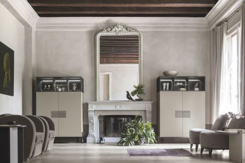 Sideboard Time A in black CDF, reeded arena CDF, arena CDF. Wall panelling in matt Tabasco 171 lacquer. Anthracite 160 metal base.