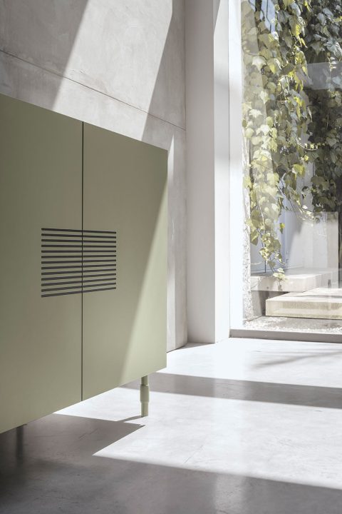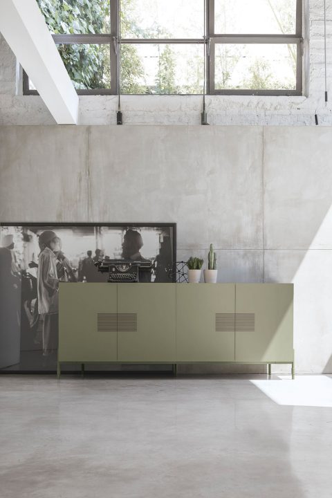 Sideboard Time G in matt mimetic green 166 lacquer CDF. Base in mimetic green 166 metal.