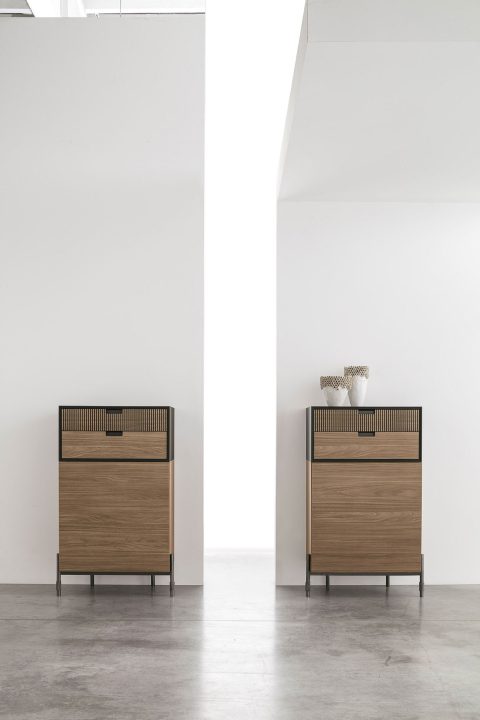 Sideboard Time H veined black CDF, amber walnut CDF, reeded amber walnut CDF. Anthracite 160 metal base.