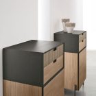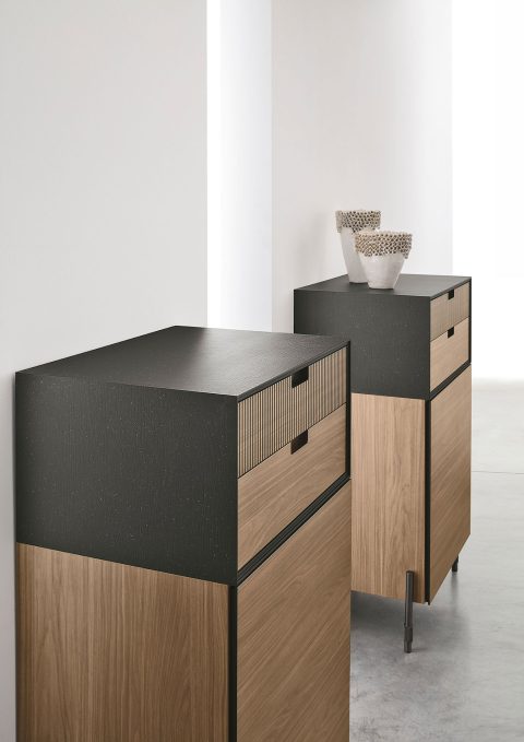 Sideboard Time L, Arena CDF. Open compartment in amber walnut CDF, veined black CDF, reeded veined black CDF. Anthracite 160 metal base.