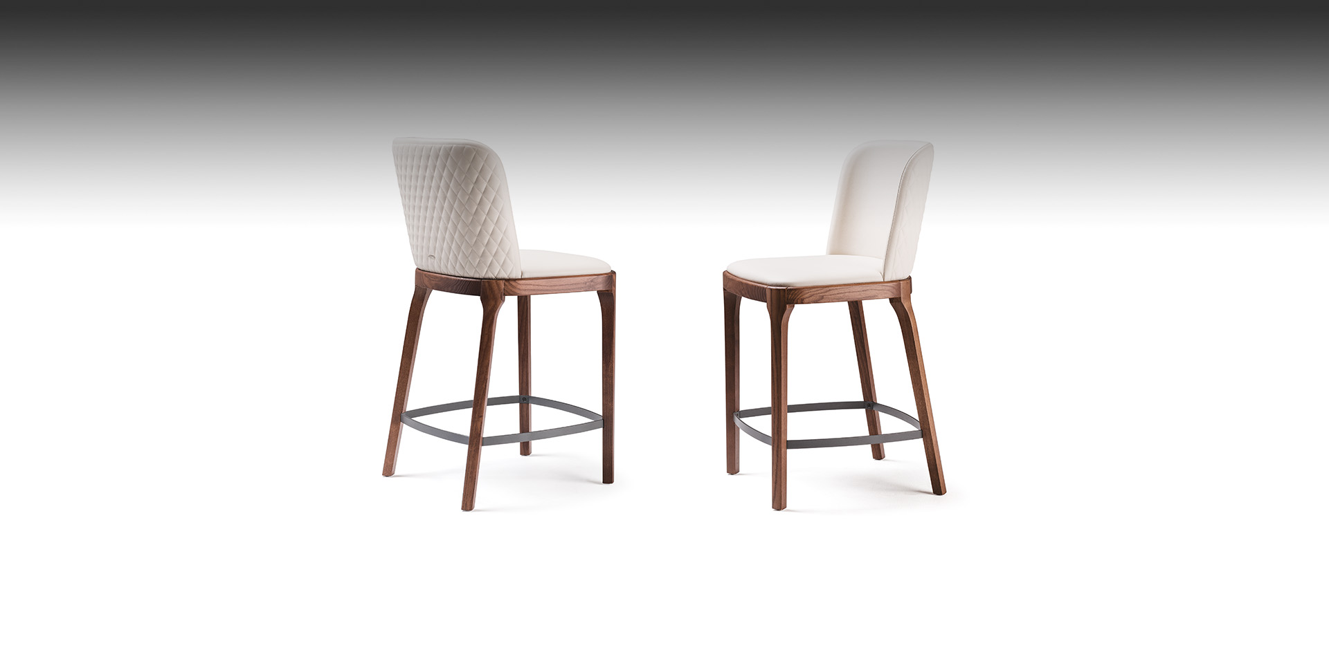 Stool with or without arms with frame in natural ashwood (frN), Canaletto walnut stained ashwood (frNC), burned oak stained ashwood (frRB), open pore matt black (fr73) painted ashwood. Seat and back upholstered in synthetic leather or soft leather as per sample card. Quilted seatback cover. The cover is not removable.