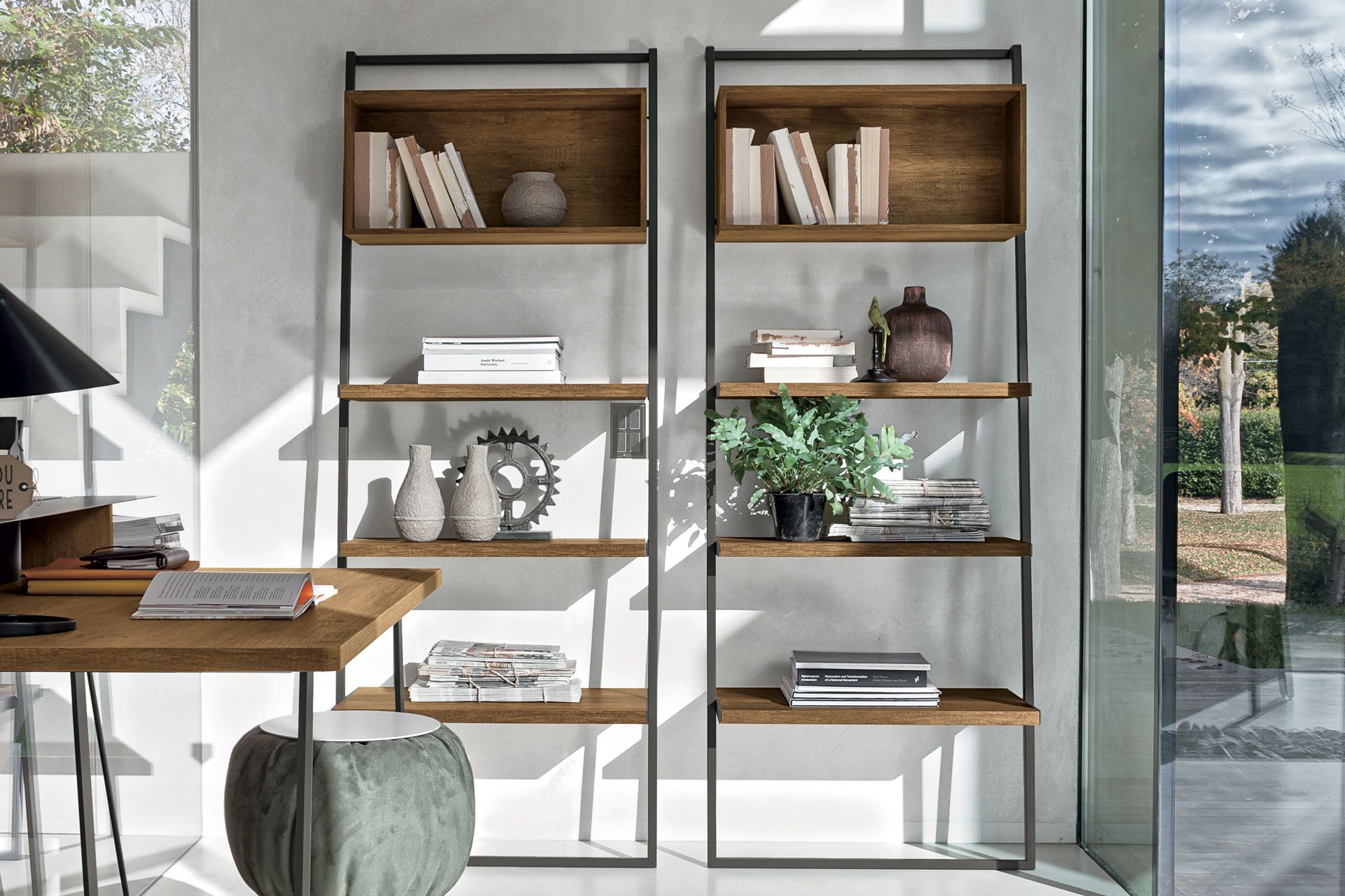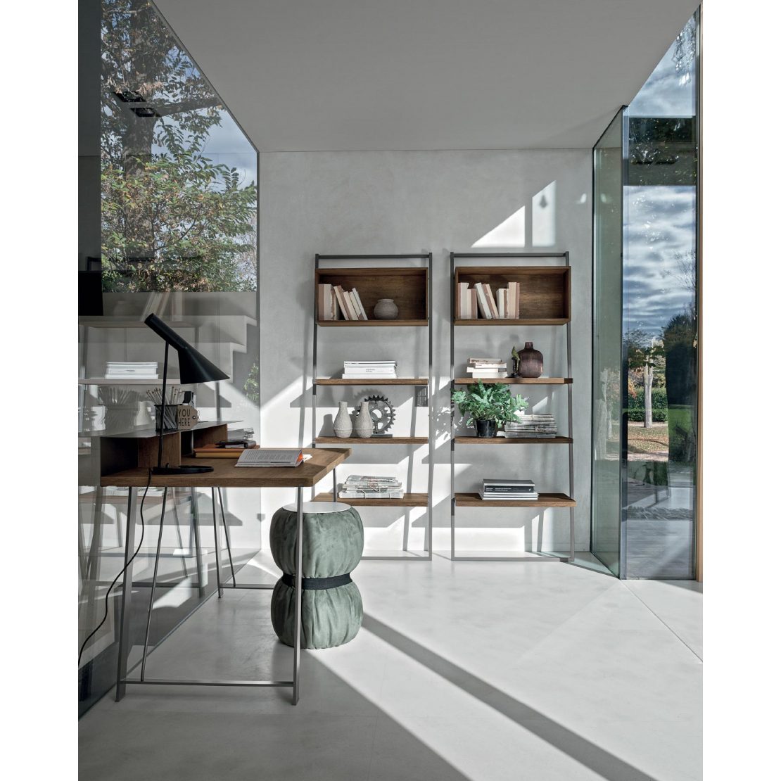 A furnishing element in several colour and finish combinations which, through a game of shelves and geometries, becomes a valid idea for organising the empty space of a wall and creating a bookcase that answers interior design tendencies.