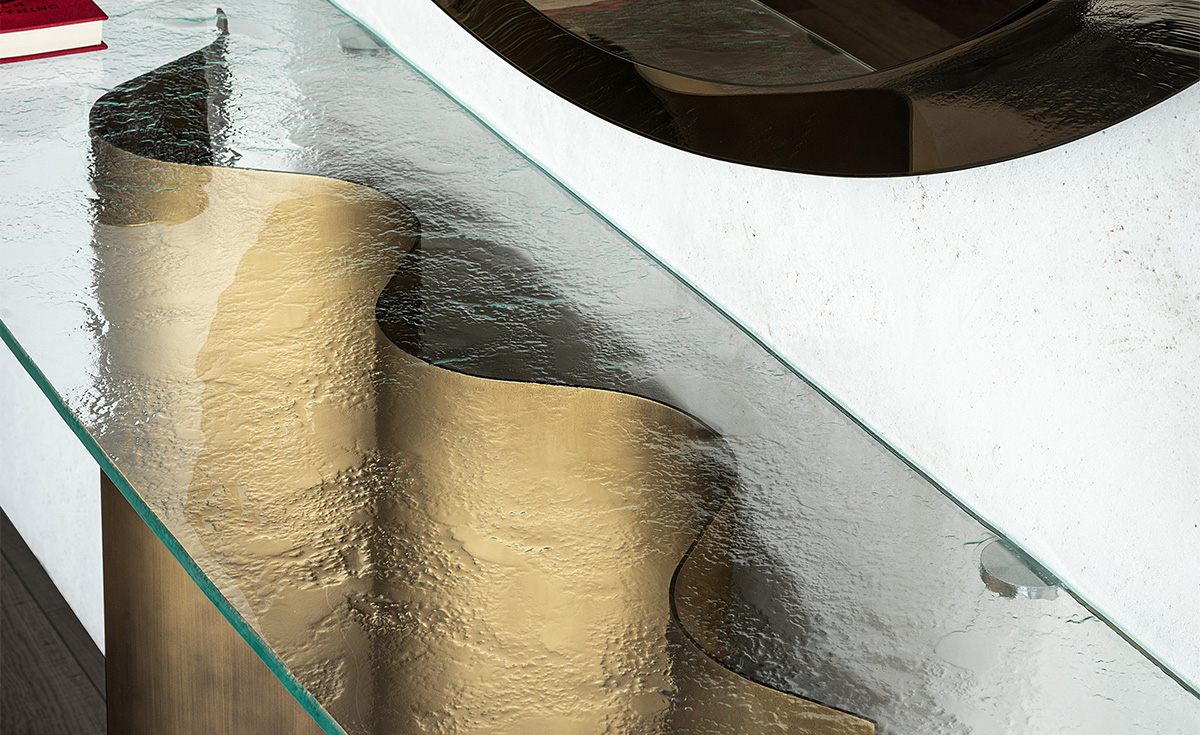 As designer Margherita Fanti says, the Nettuno modern console is «an exploration of fluid shapes and soft, seamless curves. It takes its inspiration from nature, more specifically from one of her many perfect features: waves». Its sinuous base has been cleverly designed to change in appearance depending on the position from which it is viewed. Full and empty cylinders swap places with the changing light and shadow when viewing this design console from different angles. This makes Nettuno console both slender and imposing at the same time, especially if you choose to enhance the base with a finish from the Brushed range: hand-brushed by skilled craftsmen. The curved metal base is made in one piece, adding to the quality of this glass console whose serpentine silhouette can be appreciated in its entirety.