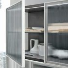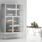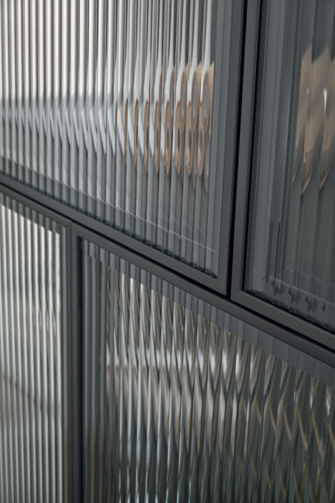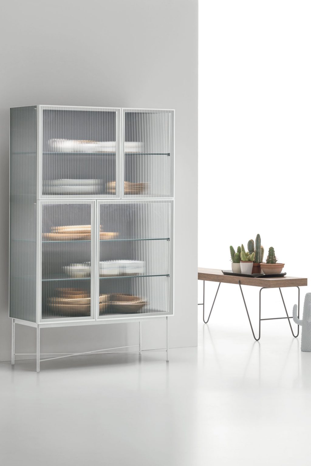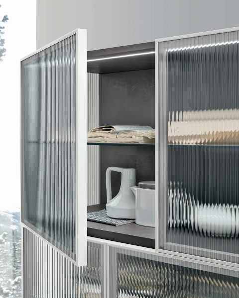 Minimal design and reeded glass for a retrò-inspired sideboard that dialogues openly with a modern furnishing style. The semi-transparent glass makes this piece and the room it is placed in more elegant.