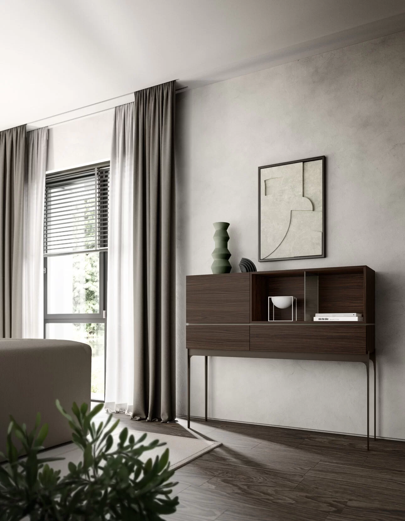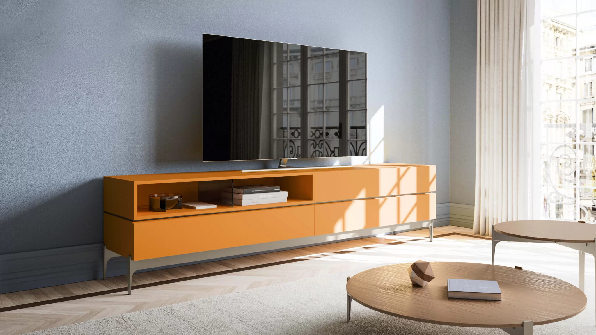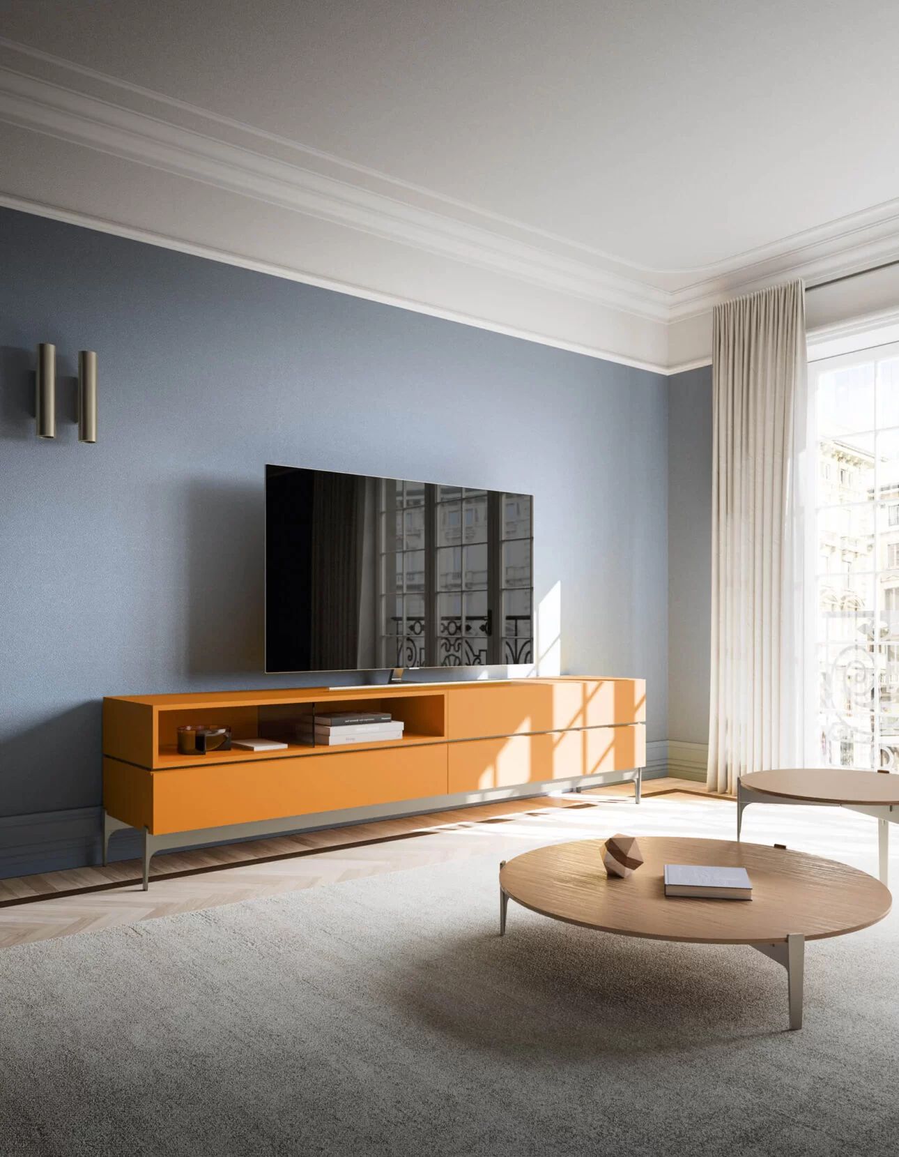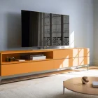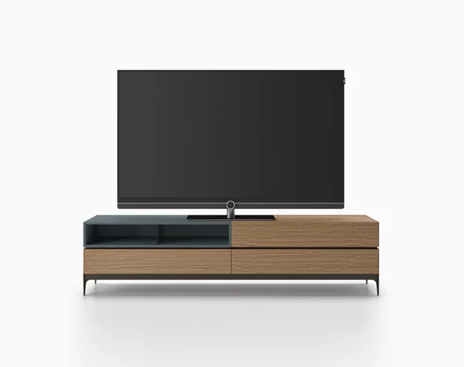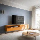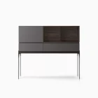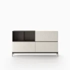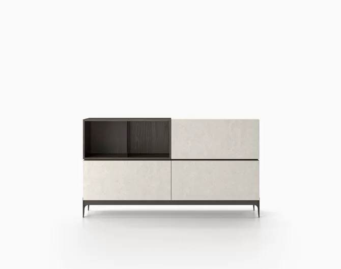 Floor-standing sideboard and console unit featuring a large open-fronted compartment at the top. The base can be customized with the Wire or Spillo stand. The light touch of a Stopsol glass partition creates new spaces within the open compartment. This element divides to create order but maintains visual continuity.