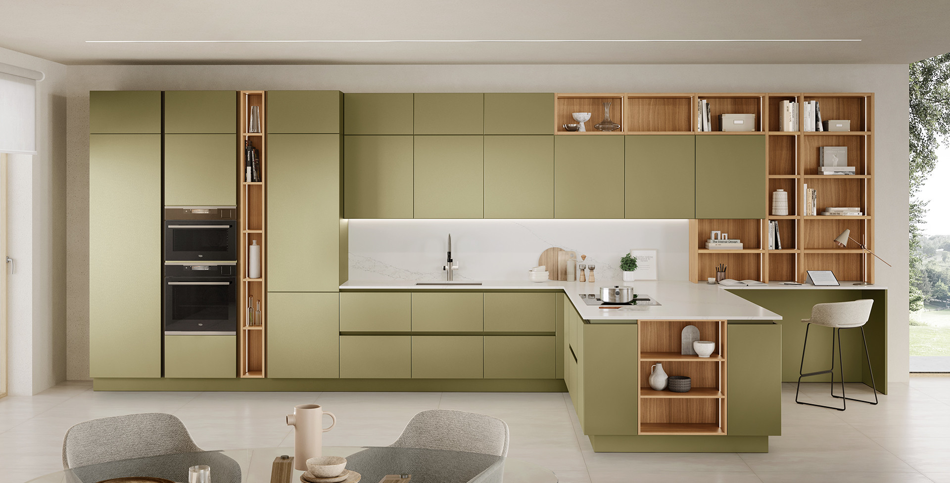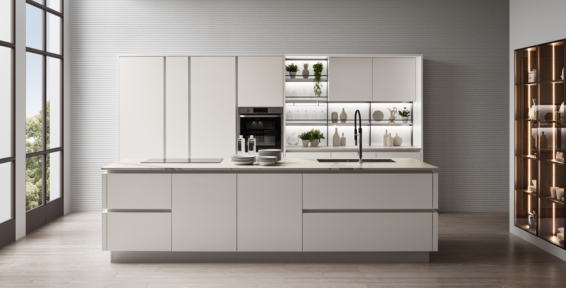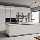 A kitchen that makes minimalism its trump card, offering a new solution for functionality requirements. Its outstanding features include its pure flat door, the up-to-date feel of the wood, the brilliant glow of modernity in the gloss lacquers, the futuristic elegance of the matte lacquers and the pleasingly natural effects obtained through a thermostructuring process are the main features, in addition to the ShellSystem structure and its evolution that uses of the ergonomically-shaped profile Pro.
